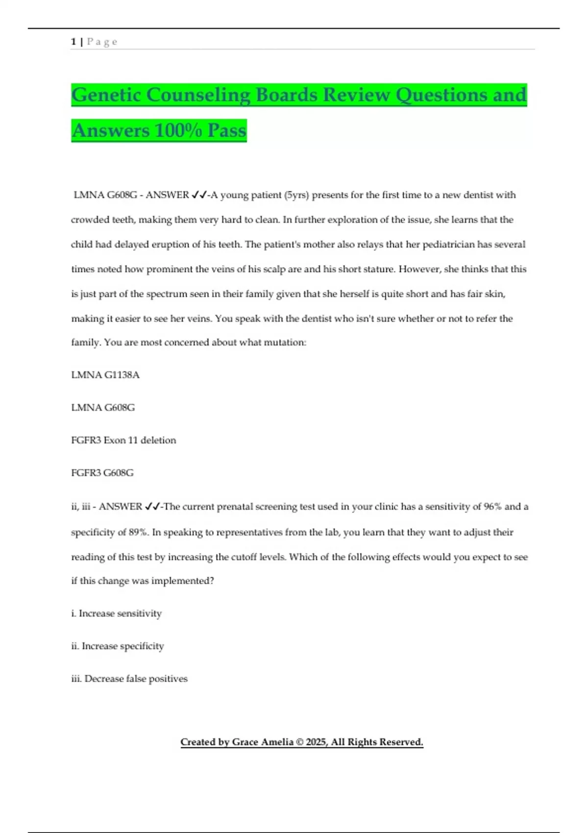 Genetic Counseling Boards Review Questions and Answers 100% Pass LMNA G608G - ANSWER -A young patient (5yrs) presents for the first time to a new dentist with crowded teeth, making them very hard to clean. In further exploration of the issue, she learns that the child had delayed eruption of his teeth. The patient's mother also relays that her pediatrician has several times noted how prominent the veins of his scalp are and his short stature. However, she thinks that this is just part of the spectrum seen in their family given that she herself is quite short and has fair skin, making it easier to see her veins. You speak with the dentist who isn't sure whether or not to refer the family. You are most concerned about what mutation: LMNA G1138A LMNA G608G FGFR3 Exon 11 deletion FGFR3 G608G ii, iii - ANSWER -The current prenatal screening test used in your clinic has a sensitivity of 96% and a specificity of 89%. In speaking to representatives from the lab, you learn that they want to adjust their reading of this test by increasing the cutoff levels. Which of the following effects would you expect to see if this change was implemented? i. Increase sensitivity ii. Increase specificity iii. Decrease false positives 2 | P a g e Created by Grace Amelia © 2025, All Rights Reserved. iv. Decrease false negatives None of the above are reasons that MTHFR testing should be conducted - ANSWER -Which of the following scenarios would MTHFR testing be appropriate? a. Recurrent pregnancy loss b. Thrombophilia, in the presence of negative primary thrombophilia testing c. Open neural tube defect identified on prenatal ultrasound, despite adequate folic acid intake d. Patients about to start a methotrexate chemotherapy regimen e. none of the above c - ANSWER -Genetic drift is an exception of which of the following assumptions of Hardy Weinberg: a. No mutation b. No migration c. Population is infinitely large d. Random mating Marfan Syndrome (utility of testing influenced by physical evaluation) - ANSWER -For which indication would telehealth service delivery model be inappropriate? Breast cancer Marfan Syndrome Carrier screening Cascade testing 1/100 3 | P a g e Created by Grace Amelia © 2025, All Rights Reserved. --With incidence of disease in AJ being 1/1000, man's carrier risk is about 1/18 --Woman's risk of being a carrier is 2/3 since her parents are obligate carriers and she is not affected -- ⅔ x ½ x 1/18 x ½ = 1/108 = ~1/100 - ANSWER -A couple is seen for preconception counseling. The woman's brother has Gaucher disease, and she has Ashkenazi Jewish ancestry (Gaucher disease incidence of 1 in 1,000). Before doing any genetic testing, which of the following is closest to the risk of the couple having an affected child? 1/50 1/100 1/150 1/200 c. Missense mutation in EDA1 *The condition being described is hypohidrotic ectodermal dysplasia which is most often caused by EDA1 mutations. - ANSWER -You are meeting a 3 year old little boy in the pediatric genetics clinic. His parents were referred to the clinic by his astute dentist who mentioned he did not have as many teeth as expected. On meeting the boy, you also note he has sparse hair. His parents also tell you he tends to get overheated when he plays outside. Based on these findings, what is the most likely genetic cause of his signs and symptoms? a. Missense mutation in IKBKG b. Deletion in OCA2 c. Missense mutation in EDA1 *The condition being described is hypohidrotic ectodermal dysplasia which is most often caused by EDA1 mutations. d. Translocation interrupting SPRED1 4 | P a g e Created by Grace Amelia © 2025, All Rights Reserved. b. Countertransference *The GC is displaying countertransference as she is transferring her feelings and experiences with RP in her friend onto the client/the family. - ANSWER -A genetic counselor in the ophthalmology clinic is meeting with a family who have a 12 year old son recently diagnosed with retinitis pigmentosa. Throughout the appointment, the patient's father makes disparaging remarks about blindness and his son being handicapped. The genetic counselor finds herself to be annoyed and angry with the father. The genetic counselor has a good friend with RP and she can't help but think about him as she talks with the family. What best describes the behavior and feelings of the genetic counselor? a. Transference b. Countertransference c. Resistance d. Resentment c. 12.5% Alport syndrome can be XLR, AD or AR. However, the most common form and the form consistent with the pedigree is XLR. This means for the woman's mom, there is a 50% chance she is a carrier. She has a 50% chance of passing on that X to the patient. The patient has a 50% chance of passing that onto the future child. Note, that because it's X linked, females with the condition may or may not manifest in symptoms. ½ * ½ *½ = ⅛ or 12.5% - ANSWER -You are meeting with a 30 year old woman to discuss a family history of reported Alport syndrome. She is hoping to start a family in the near future and wishes to know her risk to have a child with the condition. After taking the family history, you notice that only males are affected and there is no male-male transmission. The patient's maternal uncle is affected. Based on this family history, what is the highest recurrence risk you would quote for this patient to have a child with Alport syndrome? 5 | P a g e Created by Grace Amelia © 2025, All Rights Reserved. a. 50% b. 25% c. 12.5% d. Less than 1% b. Lisch nodules. Learning disabilities and ADHD can be seen in Legius and NF1, lisch nodules are the most common clinic sign of NF1 and do not occur in NF2 or Legius, polydactyly is a key feature of any of these conditions - ANSWER -A 12 year old female is referred to genetics after her PCP finds 5 café au lait spots on physical exam. She also has freckling in her armpits. Which of the following clinical findings would be most helpful for diagnosing her? a. Learning disability b. Lisch nodules c. AD
