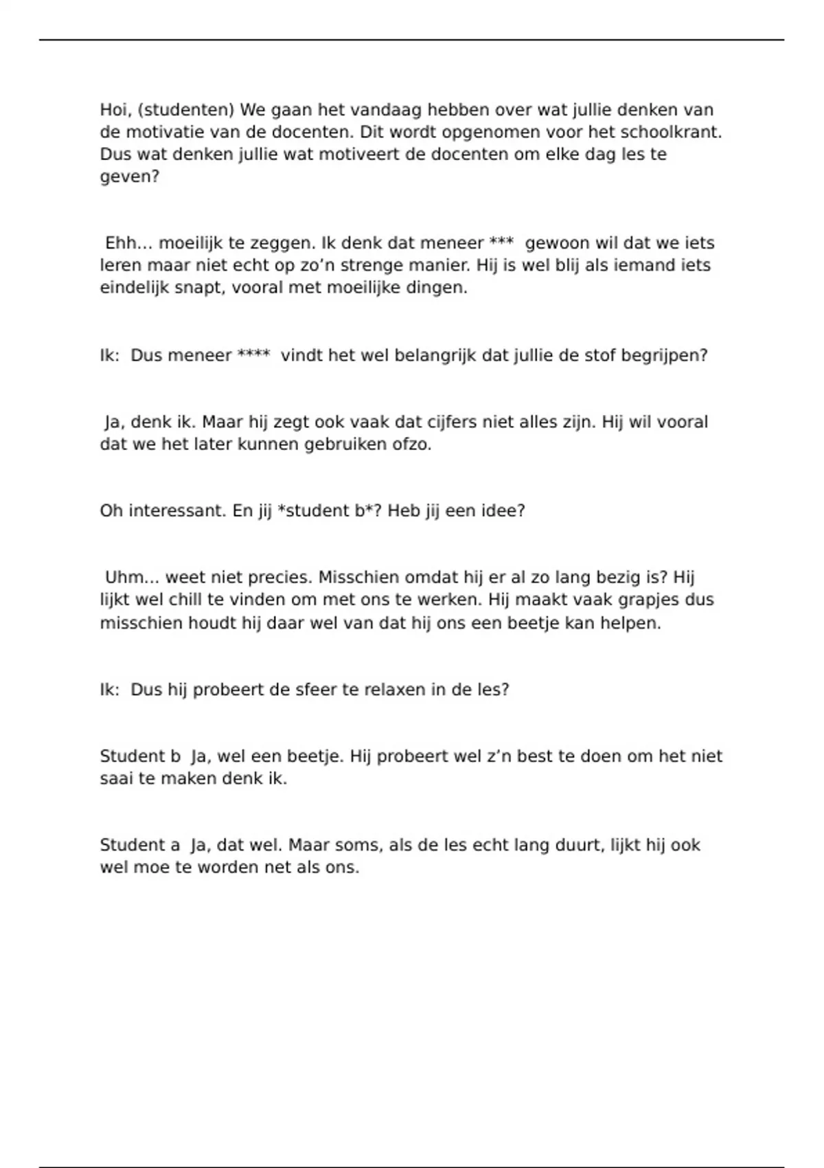 de motivatie van de docenten. Dit wordt opgenomen voor het schoolkrant.