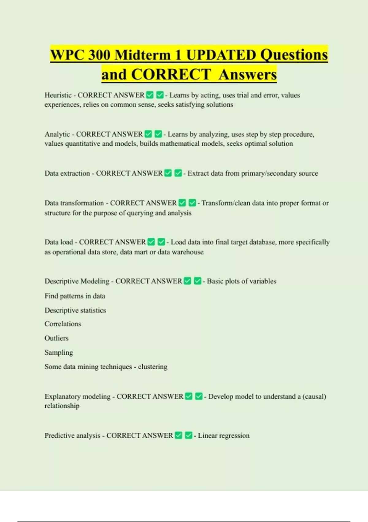 WPC 300 Midterm 1 UPDATED Questions and CORRECT Answers Heuristic - CORRECT ANSWER - Learns by acting, uses trial and error, values experiences, relies on common sense, seeks satisfying solutions Analytic - CORRECT ANSWER - Learns by analyzing, uses step by step procedure, values quantitative and models, builds mathematical models, seeks optimal solution