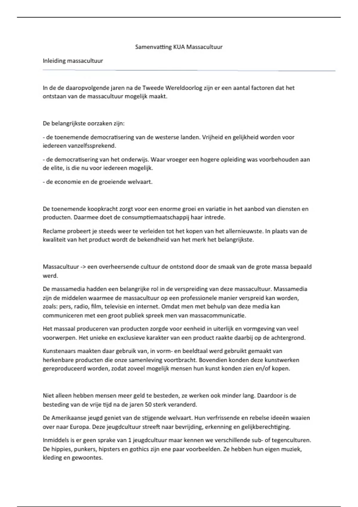 Massacultuur -> een overheersende cultuur de ontstond door de smaak van de grote massa bepaald
