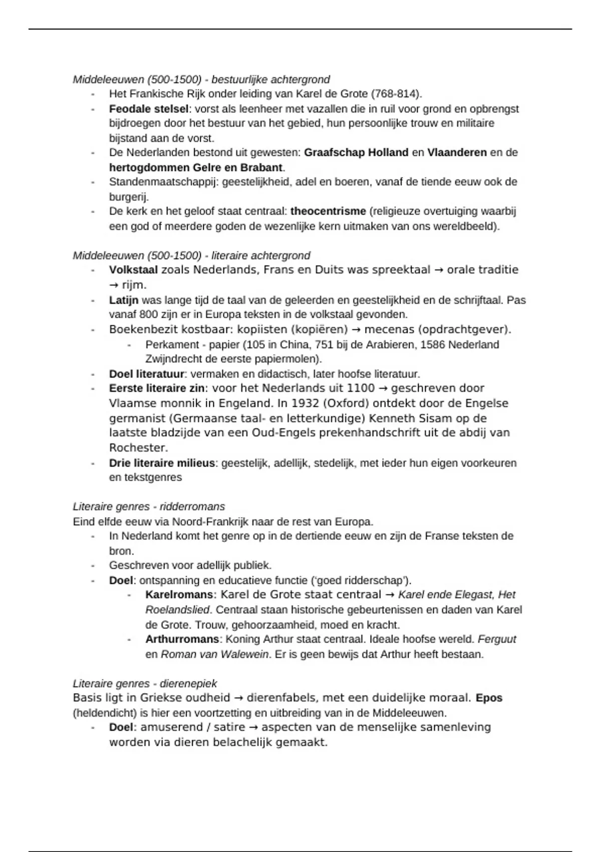 Samenvatting Nederlandse literatuurgeschiedenis over de Middeleeuwen met ridderromans, dierenepiek, geestelijke letterkunde, liederen, toneel en leerdichten; de Renaissance met rederijkersliteratuur, emblematiek, sonnetten en klassiek geïnspireerd toneel; de Verlichting met rationalistische tijdschriften, psychologische romans, robinsonades, kinderboeken en sentimentalistische literatuur typeren deze periode; en de Romantiek met historische romans, realisme, sociaal-realisme, sprookjes, horror/sciencefiction en dominee-dichtkunst.