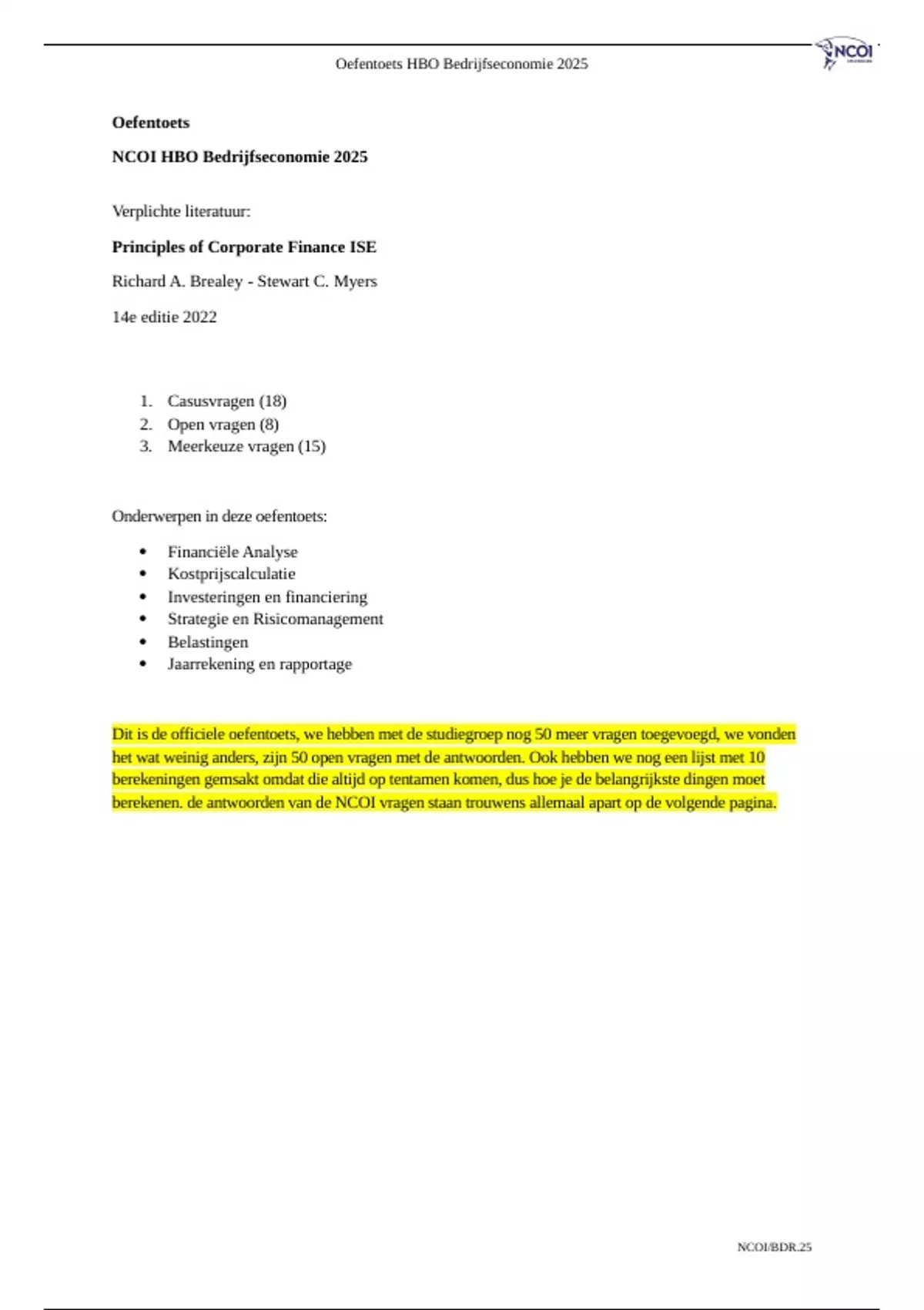 NCOI. De theorie die je hiervoor dient te gebruiken, is het boek Principles of Corporate Finance ISE