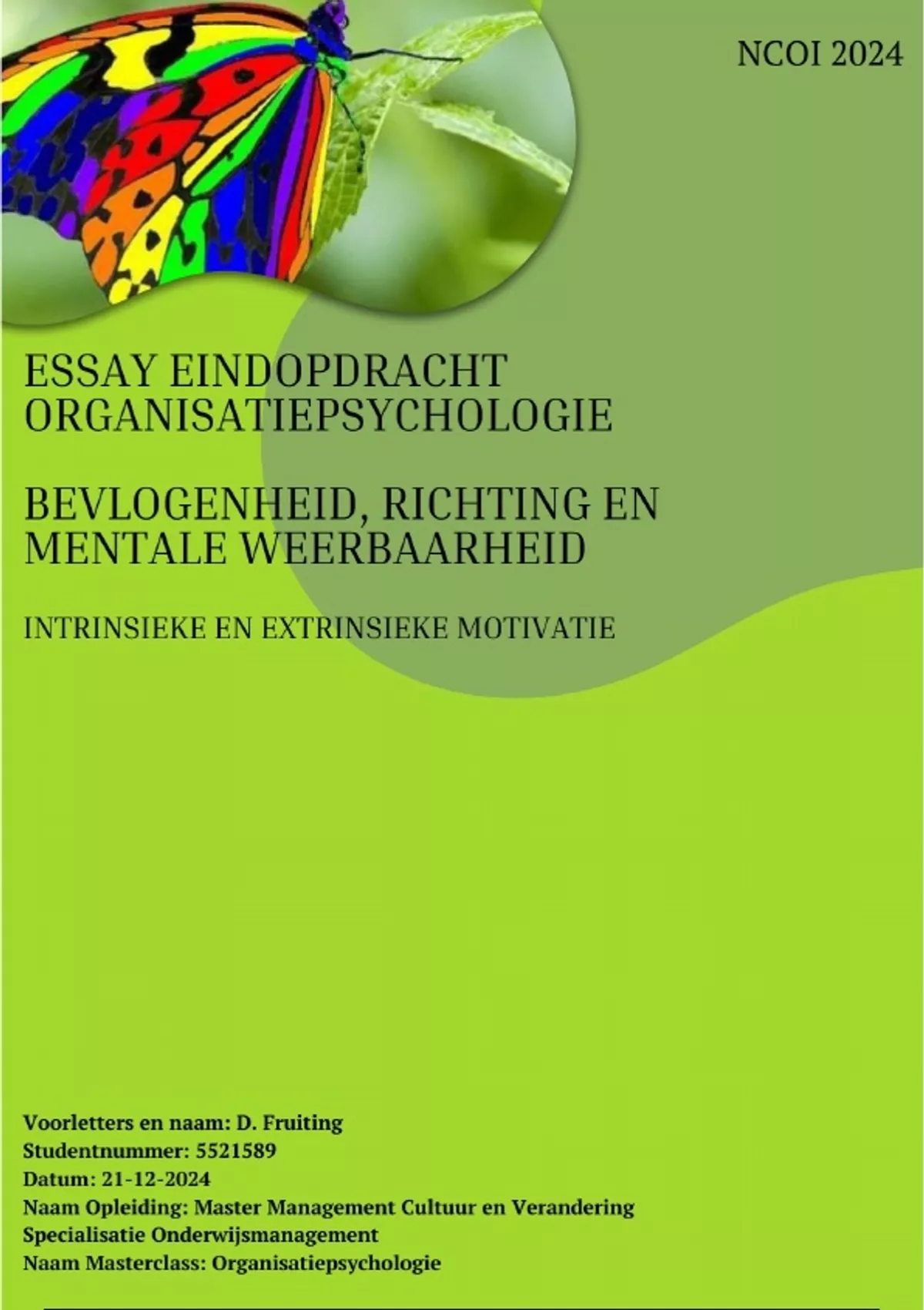 Voor u ligt mijn essay die ter afsluiting dient van de masterclass Organisatiepsychologie