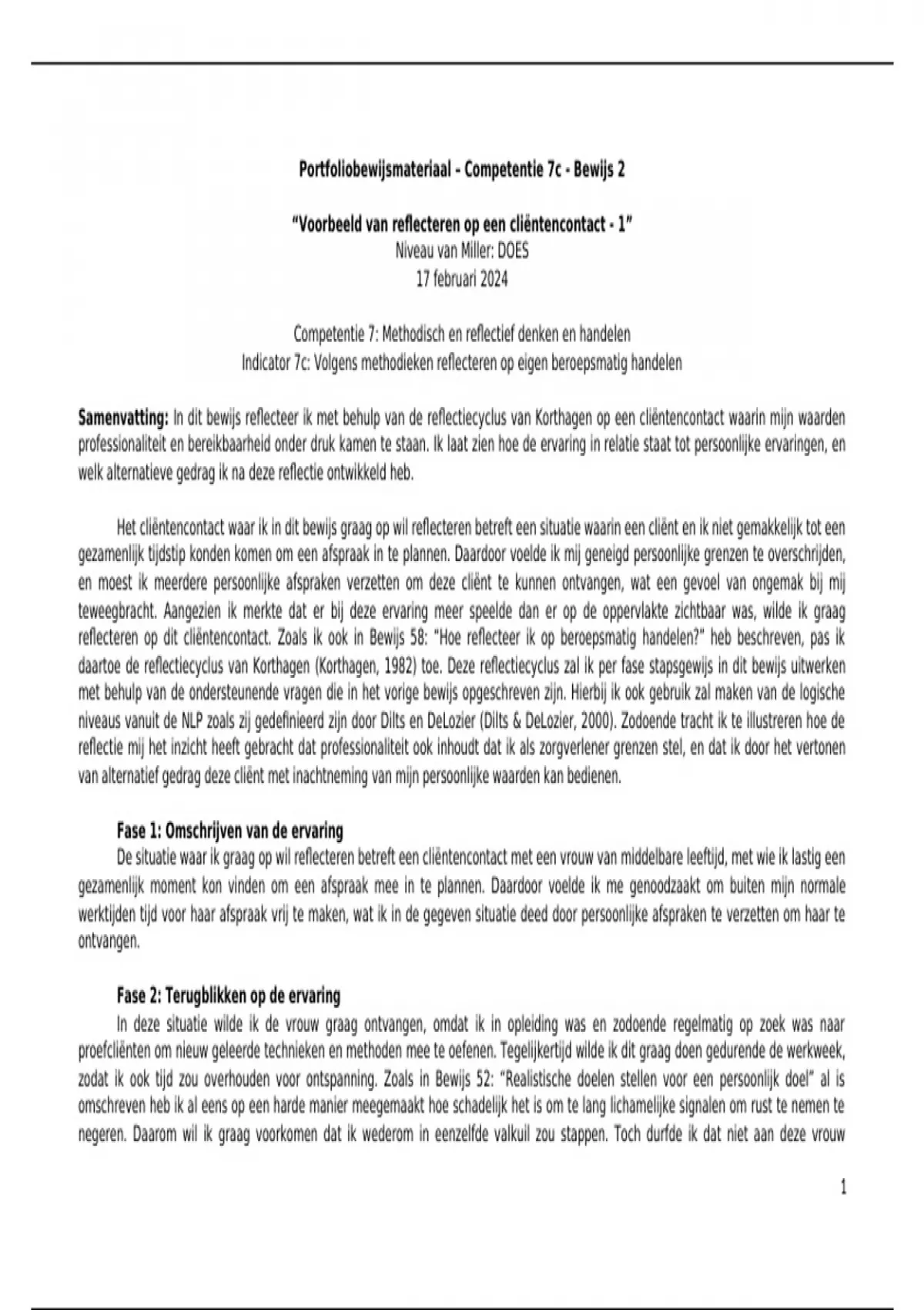 Samenvatting: In dit bewijs reflecteer ik met behulp van de reflectiecyclus van Korthagen op een cliëntencontact waarin mijn waarden