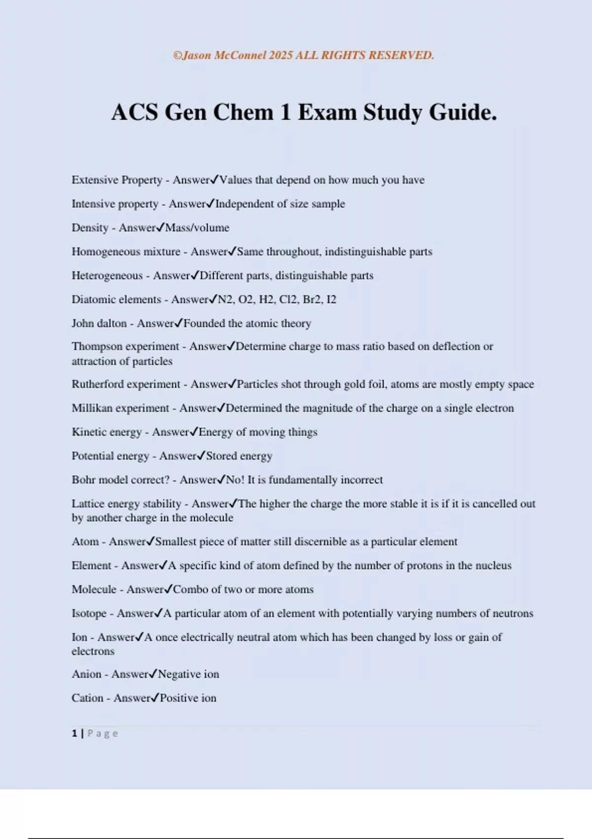ACS Gen Chem 1 Exam Study Guide. Extensive Property - AnswerValues that depend on how much you have Intensive property - AnswerIndependent of size sample Density - AnswerMass/volume Homogeneous mixture - AnswerSame throughout, indistinguishable parts Heterogeneous - AnswerDifferent parts, distinguishable parts Diatomic elements - AnswerN2, O2, H2, Cl2, Br2, I2 John dalton - AnswerFounded the atomic theory Thompson experiment - AnswerDetermine charge to mass ratio based on deflection or attraction of particles Rutherford experiment - AnswerParticles shot through gold foil, atoms are mostly empty space Millikan experiment - AnswerDetermined the magnitude of the charge on a single electron Kinetic energy - AnswerEnergy of moving things Potential energy - AnswerStored energy Bohr model correct? - AnswerNo! It is fundamentally incorrect Lattice energy stability - AnswerThe higher the charge the more stable it is if it is cancelled out by another charge in the molecule Atom - AnswerSmallest piece of matter still discernible as a particular element Element - AnswerA specific kind of atom defined by the number of protons in the nucleus Molecule - AnswerCombo of two or more atoms Isotope - AnswerA particular atom of an element with potentially varying numbers of neutrons Ion - AnswerA once electrically neutral atom which has been changed by loss or gain of electrons Anion - AnswerNegative ion Cation - AnswerPositive ion