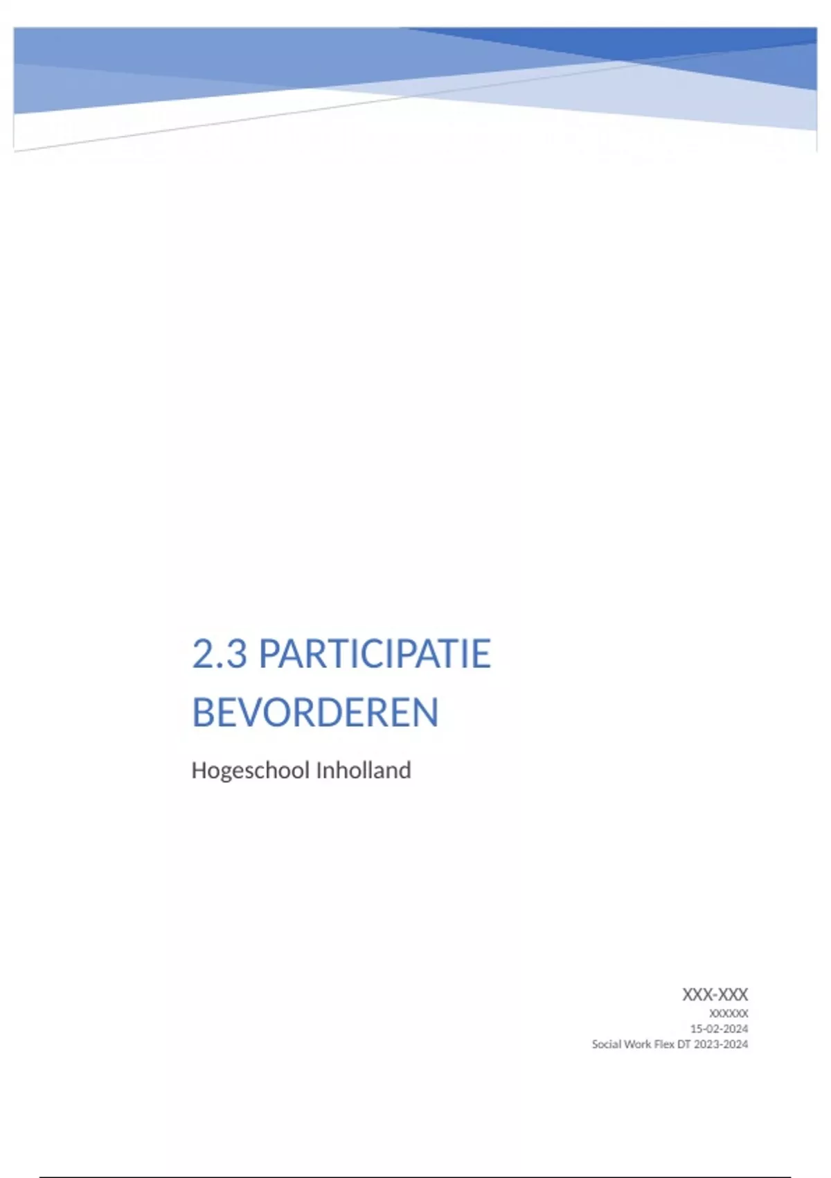 Hierbij presenteer ik u mijn verslag van module 2.3 Participatie Bevorderen. Dit verslag bestaat uit 2