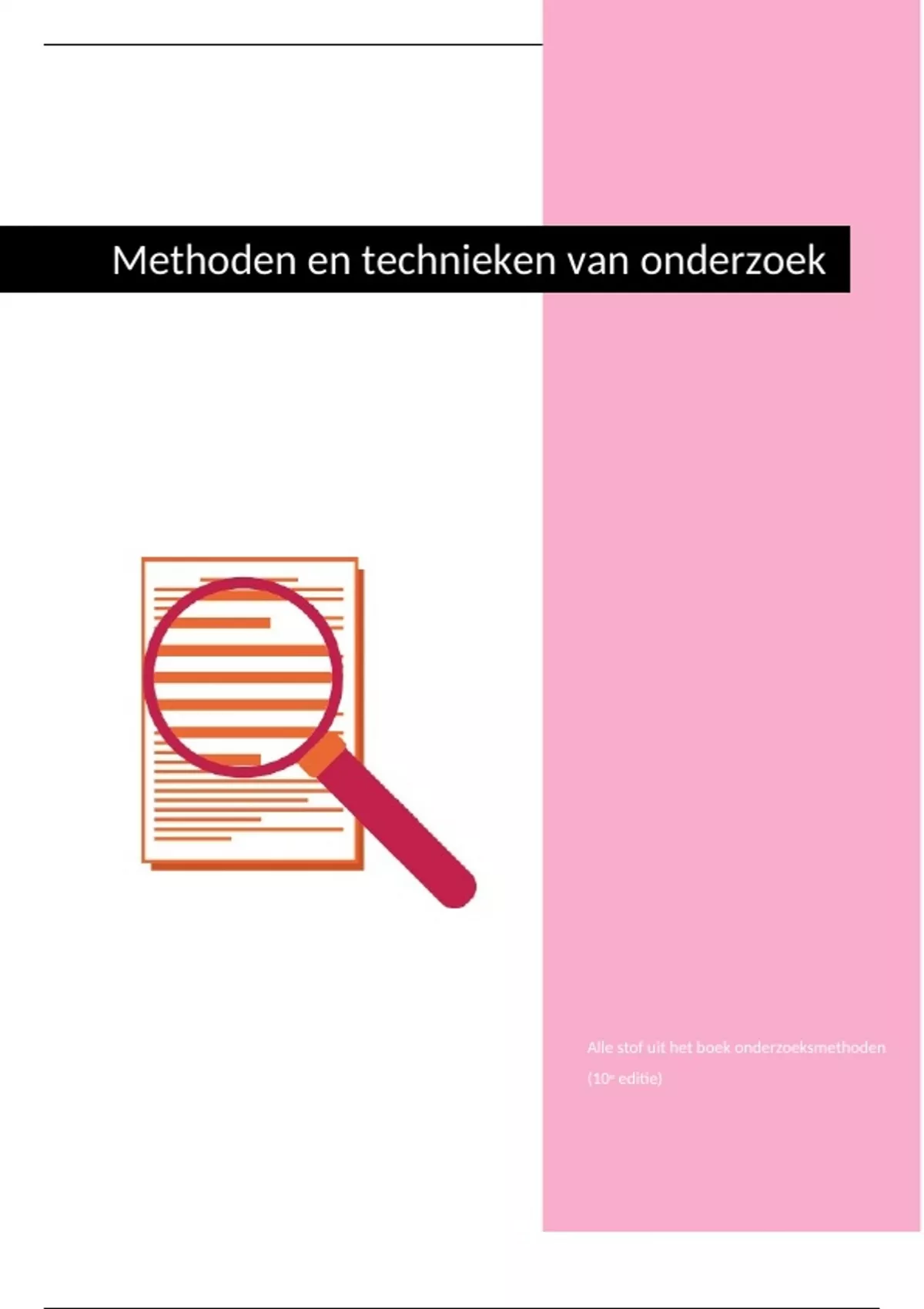 hierbij een samenvatting van het boek onderzoeksmethoden (10e editie), gebruikt voor het vak 'methoden en technieken van onderzoek in de sociale wetenschappen', aan de rug (1e jaars vak). De hoofdstukken 2,3,4,5,6 en 10 worden behandeld.