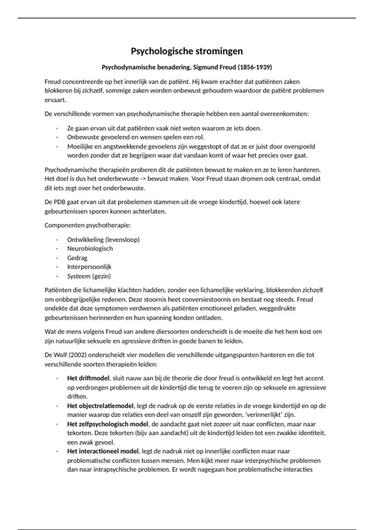 Samenvatting van verschillende psychologische stromingen. De psychodynamische benadering, cognitief-gedragstherapeutische benadering, experiëntiële benadering, cliëntgerichte benadering, lichaamsgerichte benadering, systeemgerichte benadering, oplossingsgerichte benadering en positieve psychologie komen aan bod.