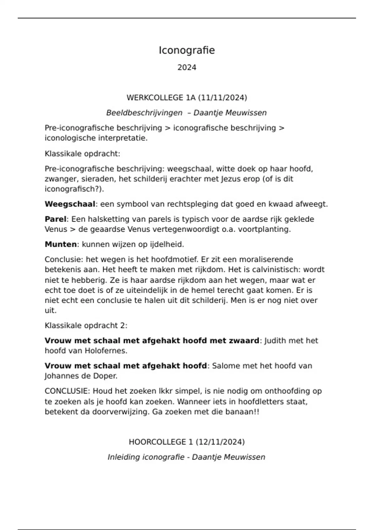 In dit document vind je alle informatie van week 1 tot en met 6 + werkcollege 7 die je nodig hebt voor het tentamen van iconografie op 24 januari 2025. Dit document bevat aantekeningen van hoorcollege 1 tot en met 6; aantekeningen van de werkcolleges van week 1 tot en met 7 en samenvattingen van bijbehorende literatuur.