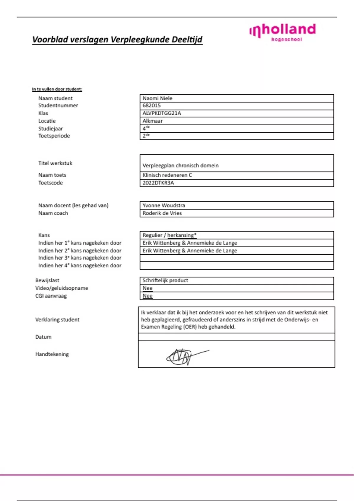 Voor de deeltijd opleiding van de hbo-v is er een verpleegplan geschreven voor het vak klinisch redeneren. Dit verslag voldoet aan de eisen van het eindniveau, niveau C. Er is gebruik gemaakt van een chronische zorgvrager die opgenomen lag op een chirurgische afdeling in het ziekenhuis. Hiermee werd het chronische domein aangetoond. Alle punten van het beoordelingsformulier zijn verwerkt in het verslag. Hierna is er een mondelinge assessment geweest. Veel succes bij het schrijven van jullie verpleegplan!