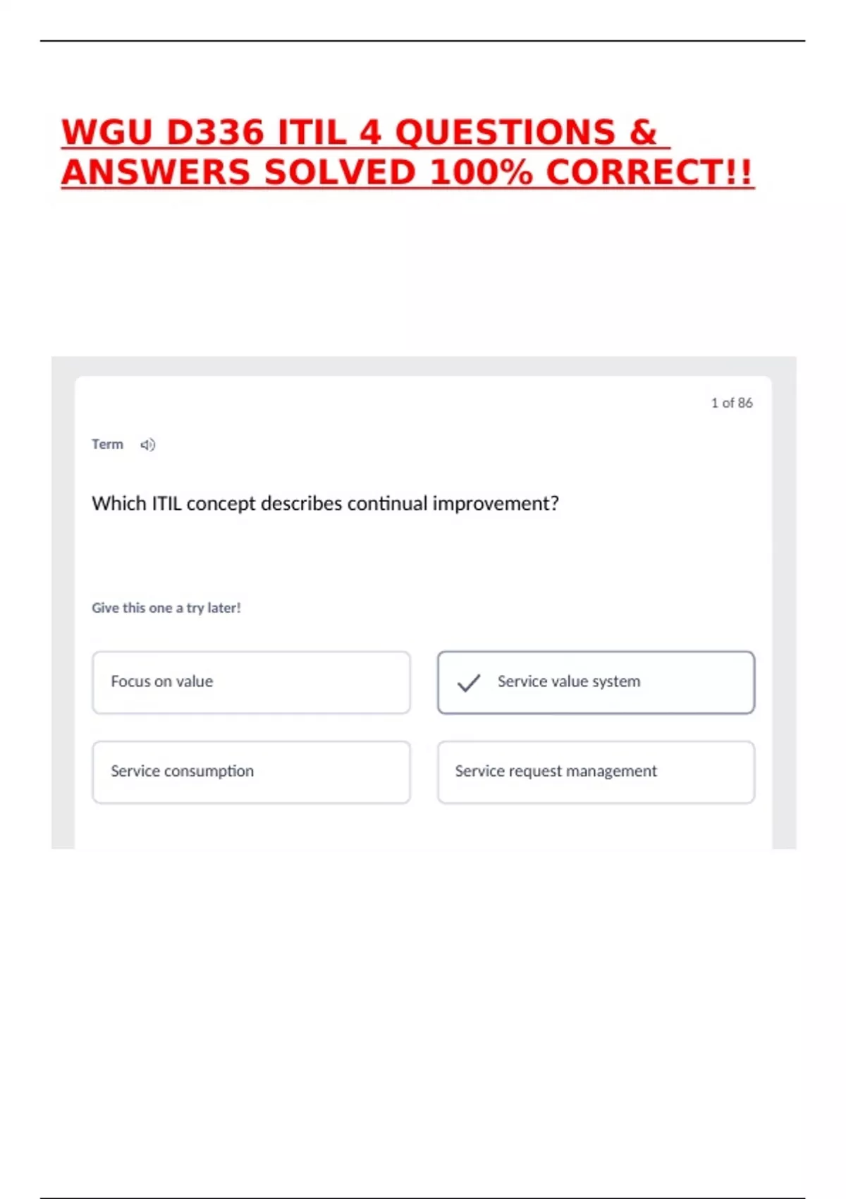 WGU D336 ITIL 4 QUESTIONS & ANSWERS SOLVED 100% CORRECT!!