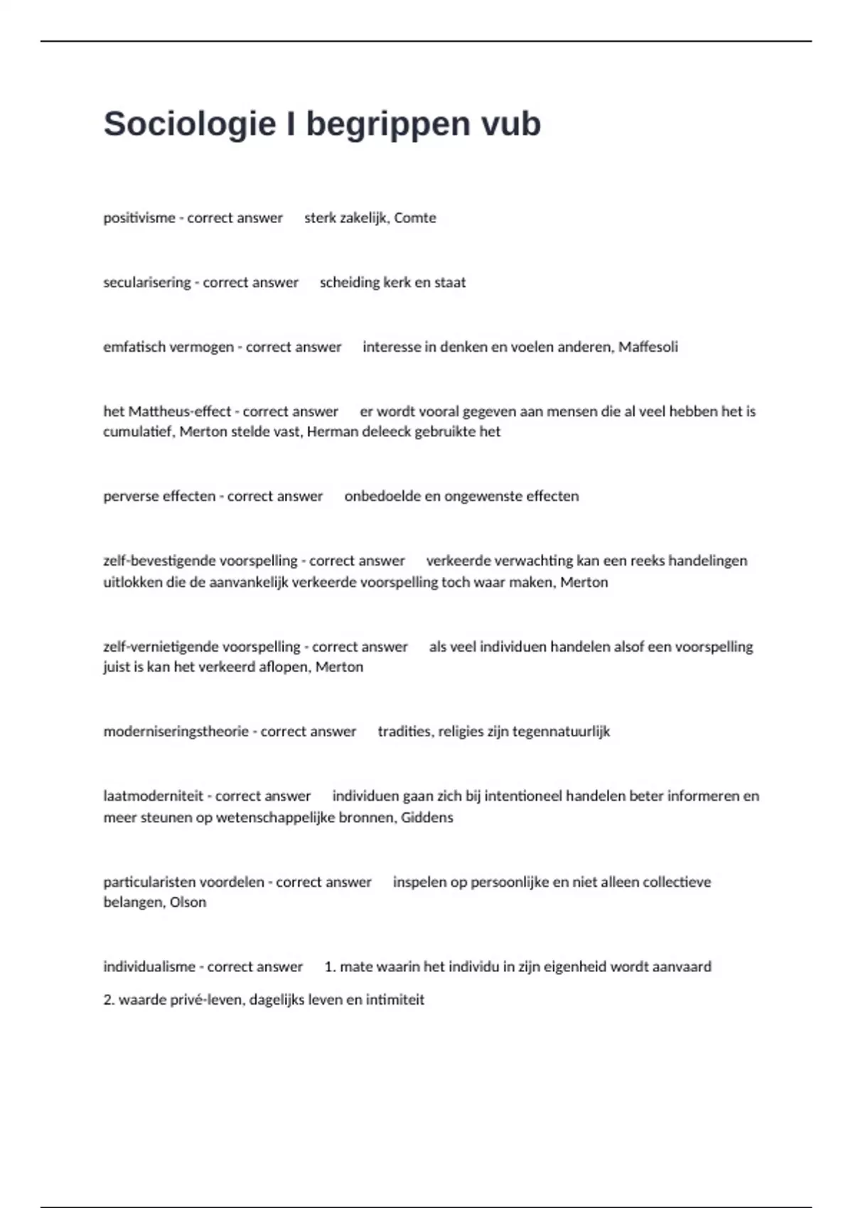 positivisme - correct answer sterk zakelijk, Comte secularisering - correct answer scheiding kerk en staat emfatisch vermogen - correct answer interesse in denken en voelen anderen, Maffesoli het Mattheus-effect - correct answer er wordt vooral gegeven aan mensen die al veel hebben het is cumulatief, Merton stelde vast, Herman deleeck gebruikte het perverse effecten - correct answer onbedoelde en ongewenste effecten zelf-bevestigende voorspelling - correct answer verkeerde verwachting kan een reeks handelingen uitlokken die de aanvankelijk verkeerde voorspelling toch waar maken, Merton zelf-vernietigende voorspelling - correct answer als veel individuen handelen alsof een voorspelling juist is kan het verkeerd aflopen, Merton moderniseringstheorie - correct answer tradities, religies zijn tegennatuurlijk laatmoderniteit - correct answer individuen gaan zich bij intentioneel handelen beter informeren en meer steunen op wetenschappelijke bronnen, Giddens particularisten voordelen - correct answer inspelen op persoonlijke en niet alleen collectieve belangen, Olson individualisme - correct answer 1. mate waarin het individu in zijn eigenheid wordt aanvaard 2. waarde privé-leven, dagelijks leven en intimiteit 3. zelfwerk: ontplooiing Foucault reductionistisch perspectief - correct answer fysieke toestand organisme is bepalend sociaal perspectief - correct answer ziekterol is fundamenteel gegeven, hoe men het in de cultuur benaderd medicalisering - correct answer grote afhenkelijkheid tov artsen en medicatie waarbij de zelfredzaamheid afneemt instrumenteel activisme - correct answer doeltreffende methodes, effectief genezen sociale verschijnselen - correct answer systemen zoals, staat, gerecht, onderwijs systeemtheorie - correct answer samenleving is een systeem dat functies moet vervullen om te kunnen voortbestaan, Parsons indoctrineren - correct answer systematisch opdringen van een mening dramaturgie - correct answer leer die het theaterspel bestudeert en beschrijft impression management - correct answer mensen spelen een rol, laten erkennen via manipulatie van kleding, poses, uitspraken, Goffman frontstage - correct answer plaats of moment waarop men optreedt, Goffman backstage - correct answer op zijn gemak, uit de rol getreden, Goffman Roldistantie - correct answer afstand nemen van zijn rol en verschil maken tussen echte zelf en rol, Goffman symbolisch interactionisme - correct answer interactie bemiddeld door de interpretatie die wordt gegeven van de symbolische voorstelling van ede handelingen, samen handelen, Mead,Goffman Civilisatieproces - correct answer verandering van regels tot in ons lichaam doorgedrongen als tweede natuur, Elias internaliseren - correct answer in lichaam binnengedrongen tot gewoonte, Elias externe dwang - correct answer van buitenaf interne dwang - correct answer van binnenuit, via opvoeding, opvattingen programma's - correct answer wijze waarop handelingen zich opeenvolgend in de tijd afspelen horen ze te lopen causale verklaring - correct answer verklaring in termen van algemene regelmaat die ons toelaat te voorspellen wat er in bepaalde omstandigheden gebeurt, Weber verstehende methode - correct answer in andere persoon komen, het handelen begrijpen als we de reden van dat handelen snappen en het gedrag hadden kunnen verwachten, weber hermeneutiek - correct answer Plaatsen in het licht van de interpretaties, opvattingen en verwachtingen van de betrokken personen. Menselijk handelen kan niet via de natuurwetenschappen worden begrepen., hermes Sociaal constructivisme - correct answer sociale werkelijkheid die wij kennen is eigenlijk geconstrueerd via onze opvattingen over die werkelijkheid. Berger en Luckmann Symbolische antropologie - correct answer Verschillende manieren waarop mensen hun omgeving en handelen van anderen begrijpen.Geertz Bronnen van symbolische verlichting - correct answer Symbolen die de handeling een betekenis geven. Geerts
