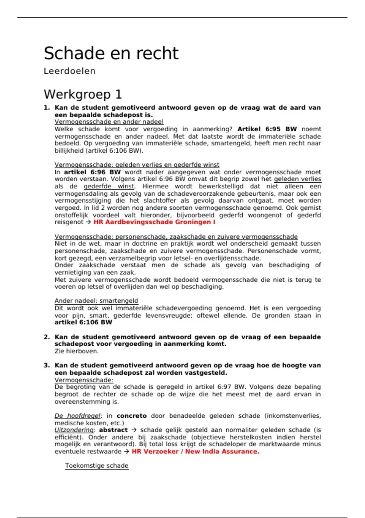 De uitgewerkte leerdoelen van het vak Schade en recht inclusief verwijzing naar arresten.