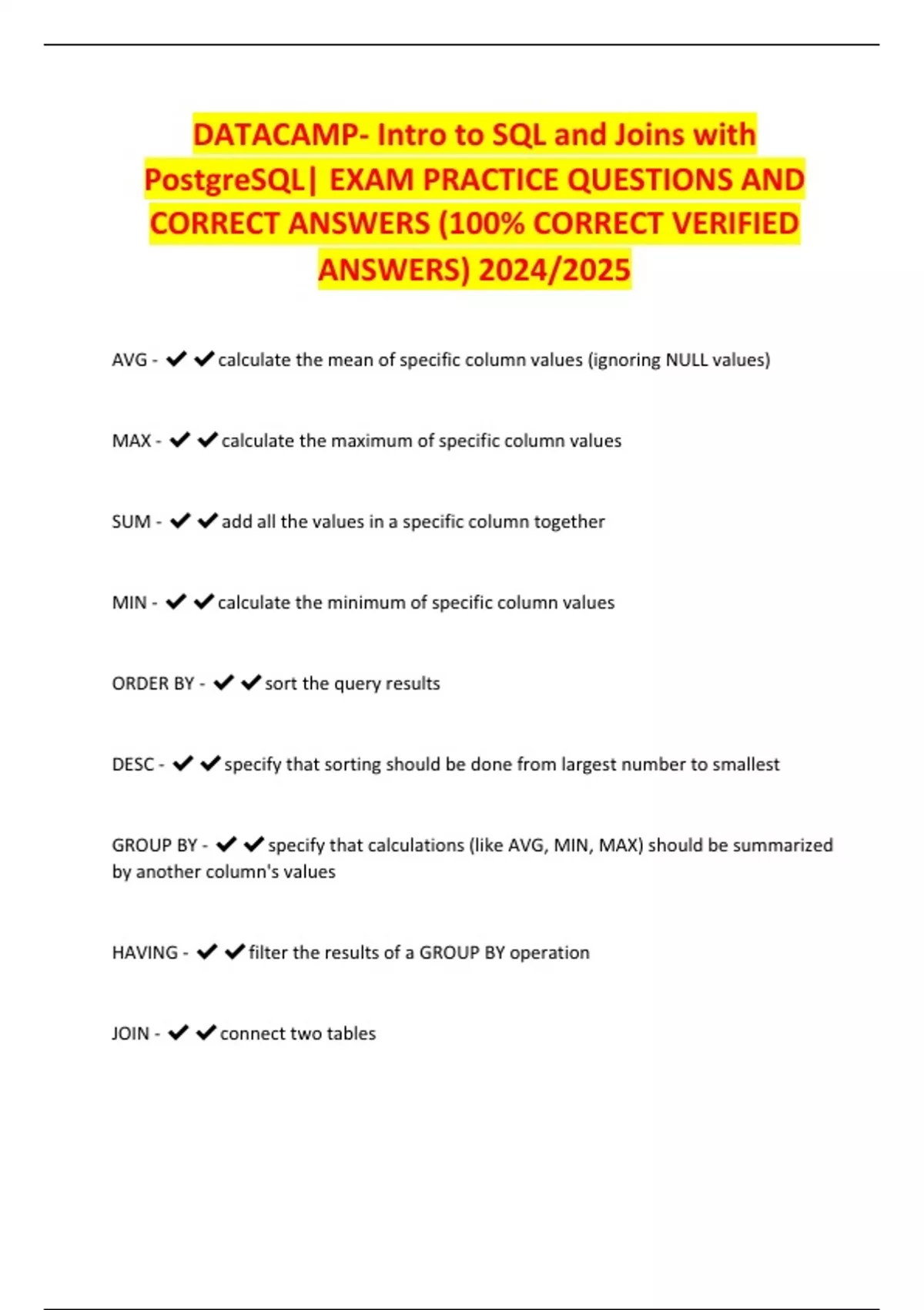 DATACAMP- Intro to SQL and Joins with PostgreSQL| EXAM PRACTICE QUESTIONS AND CORRECT ANSWERS (100% CORRECT VERIFIED ANSWERS) 2024/2025