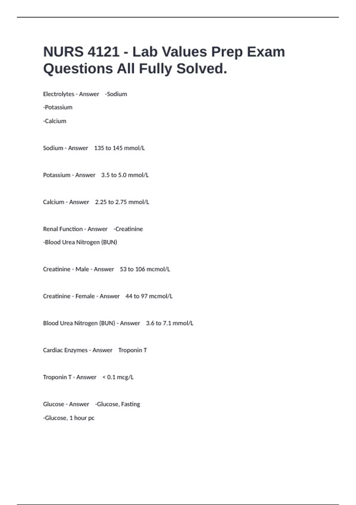Electrolytes - Answer -Sodium -Potassium -Calcium Sodium - Answer 135 to 145 mmol/L Potassium - Answer 3.5 to 5.0 mmol/L Calcium - Answer 2.25 to 2.75 mmol/L Renal Function - Answer -Creatinine -Blood Urea Nitrogen (BUN) Creatinine - Male - Answer 53 to 106 mcmol/L Creatinine - Female - Answer 44 to 97 mcmol/L Blood Urea Nitrogen (BUN) - Answer 3.6 to 7.1 mmol/L Cardiac Enzymes - Answer Troponin T Troponin T - Answer < 0.1 mcg/L Glucose - Answer -Glucose, Fasting -Glucose, 1 hour pc