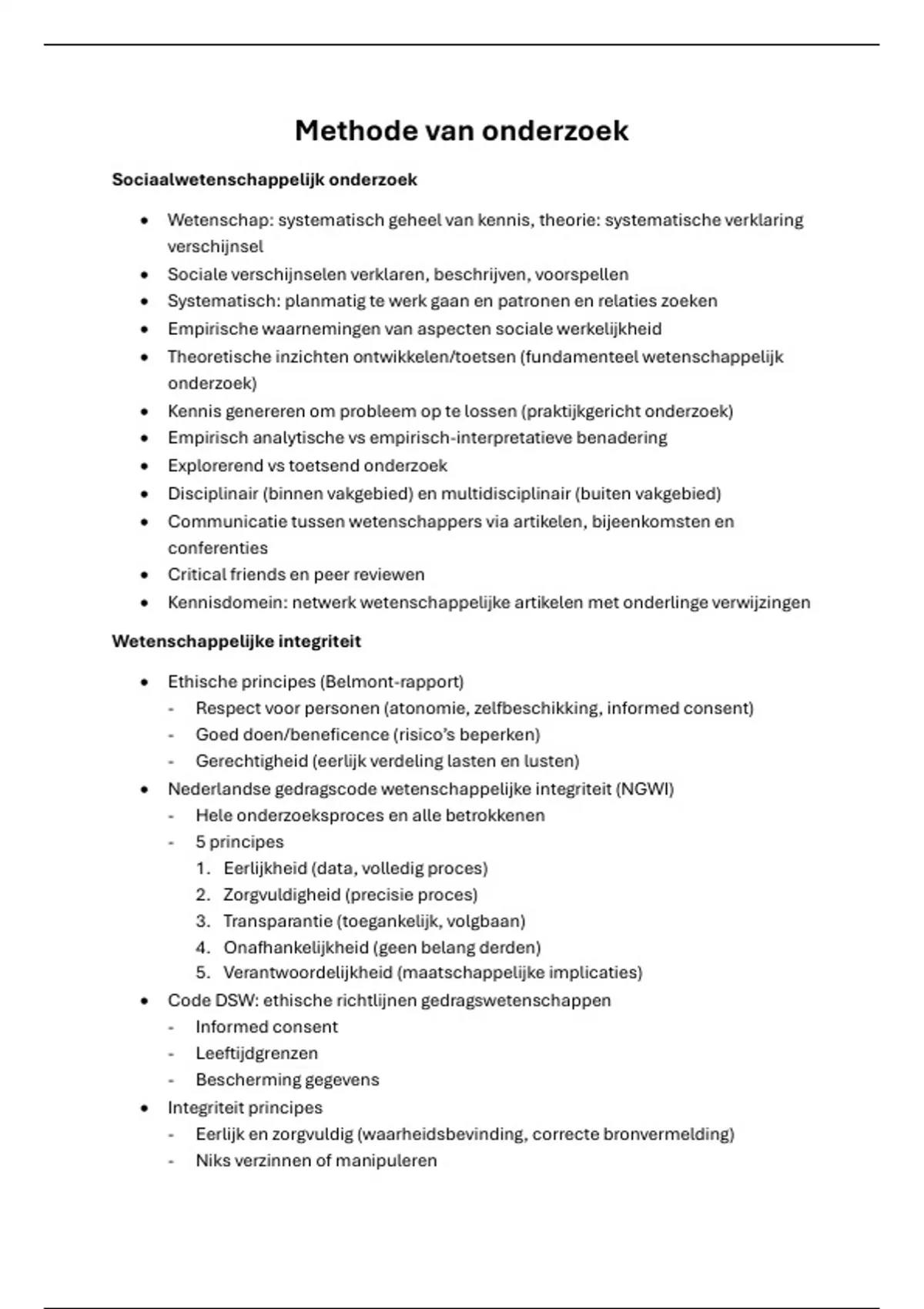 Deze samenvatting van het vak 'Methoden van onderzoek' voor de WO bachelors sociologie, caos en communicatiewetenschappen bevat het hele boek Onderzoeksmethoden 10e druk van Peer Scheepers en Hilde Tobi (2021), Locating a social situation, in: Participant Observation van J.P. Spradley (1980) en Looking at Society: Observing, Participating, Interpreting, in: Doing Qualitative Research. The Craft of Naturalistic Inquiry van J. Beuving en G. de Vries (2015). De samenvatting is geschreven dmv bullet points. Voor de Engelse stukken zijn sommige begrippen in het Engels gelaten.