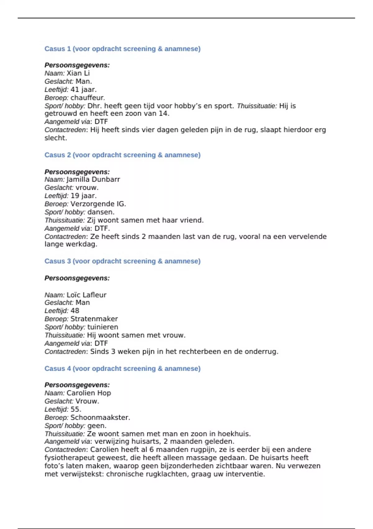 - Algemene vragen: voor- achternaam, geslacht, leeftijd, al bij een fysio