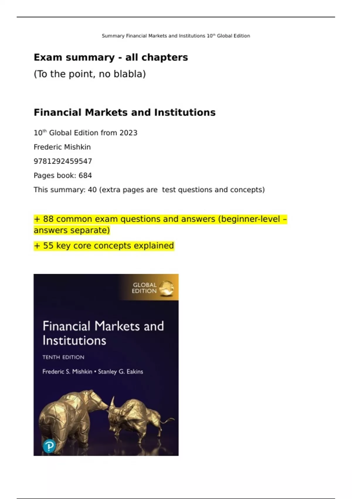 , Summary Financial Markets and Institutions 10th Global Edition