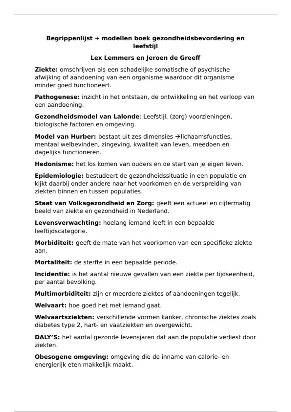 Begrippenlijst + modellen boek gezondheidsbevordering en