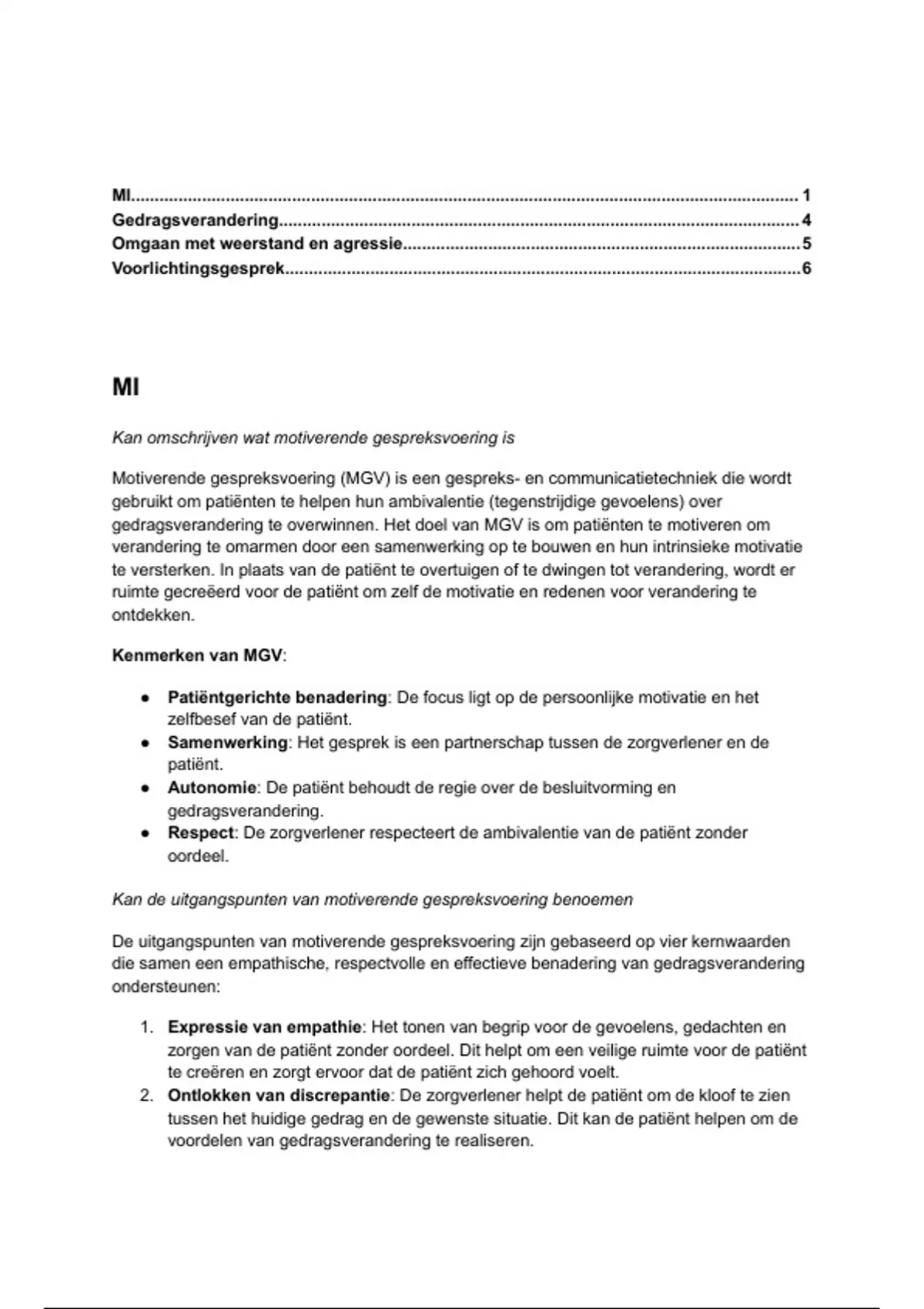 samenvatting bestaat uit volgende onderwerpen: MI Gedragsverandering Omgaan met weerstand en agressie Voorlichtingsgesprek