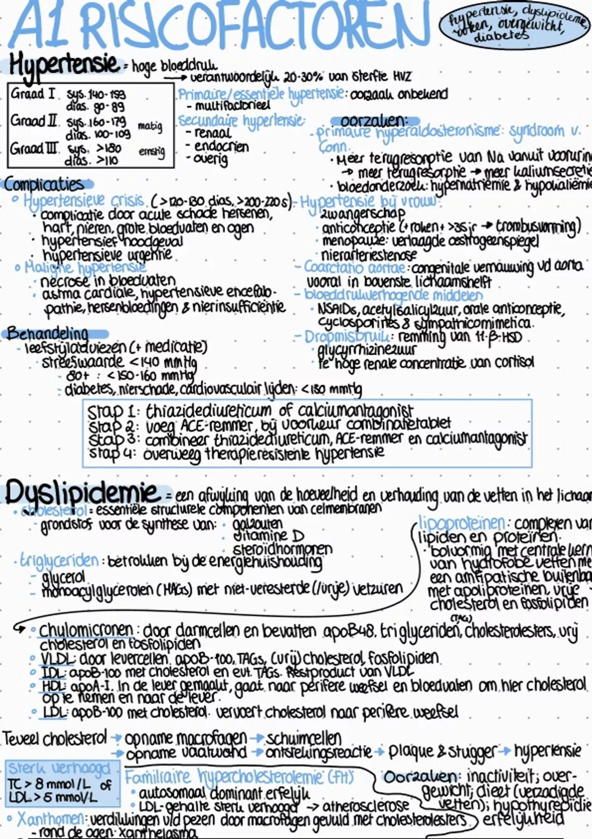 Complete en overzichtelijke handgeschreven samenvatting van cluster A KVS, module A1 Risicofactoren, van de studie geneeskunde van het Radboud.