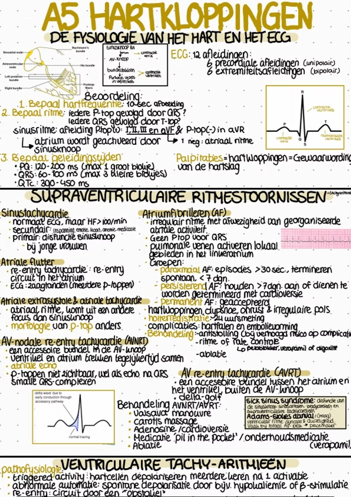 Complete en overzichtelijke handgeschreven samenvatting van cluster A KVS, module A5 Hartkloppingen, van de studie geneeskunde van het Radboud.