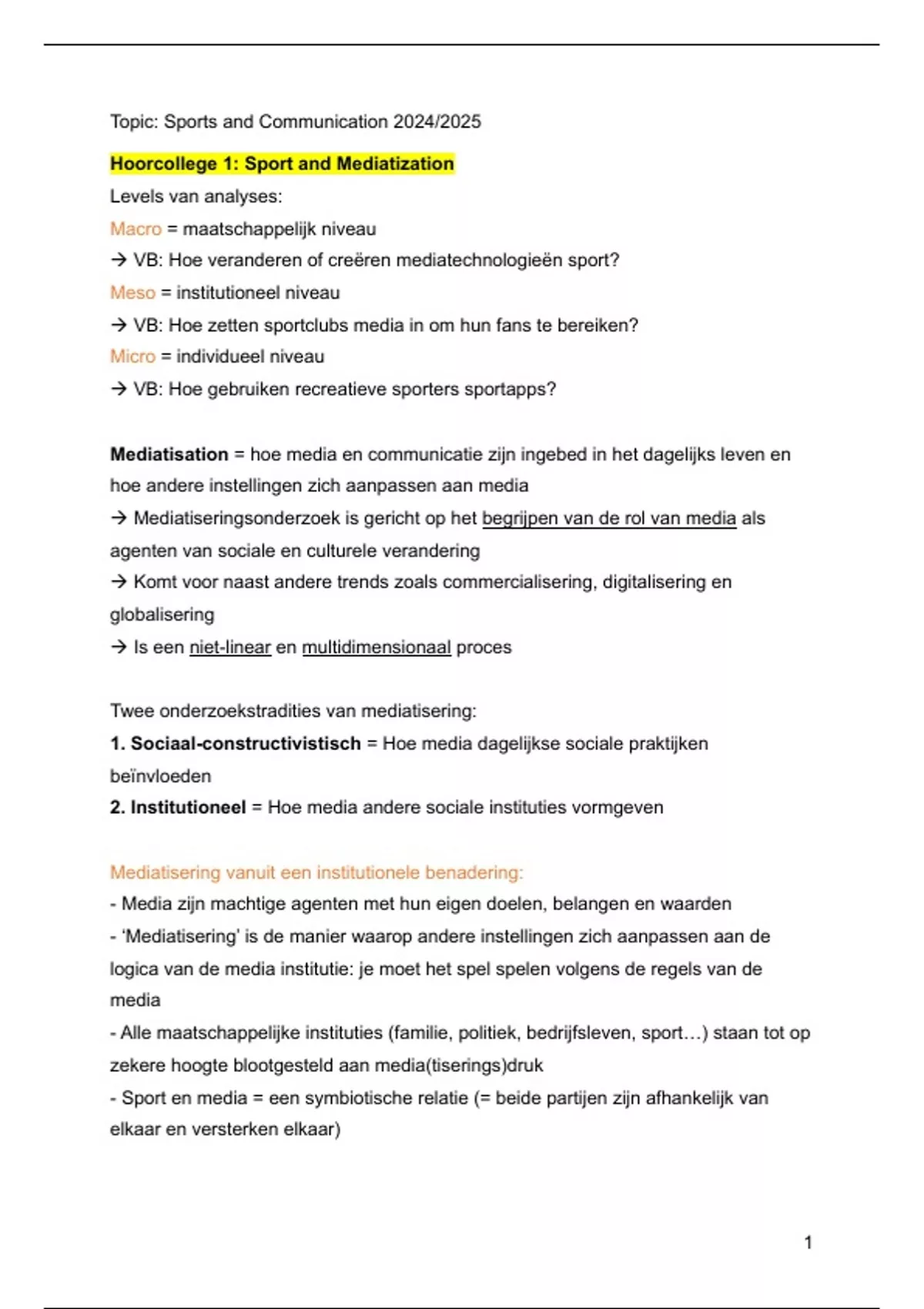 Dit is een uitgebreide samenvatting van de Topic: Sports and Communication. Alle stof van de hoorcolleges én alle verplichte literatuur voor het tentamen zijn volledig beschreven. Daarnaast zijn alle studievragen in de samenvatting verwerkt. Door het leren van deze samenvatting zou je een mooi cijfer moeten behalen op het tentamen! :)