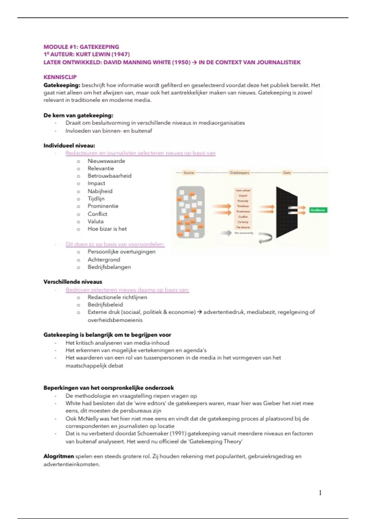 Gatekeeping: beschrijft hoe informatie wordt gefilterd en geselecteerd voordat deze het publiek bereikt. Het