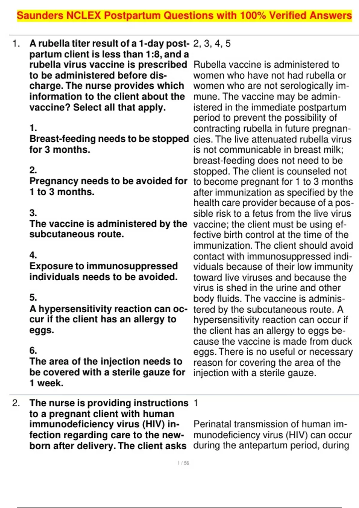 1. A rubella titer result of a 1-day post- 2, 3, 4, 5