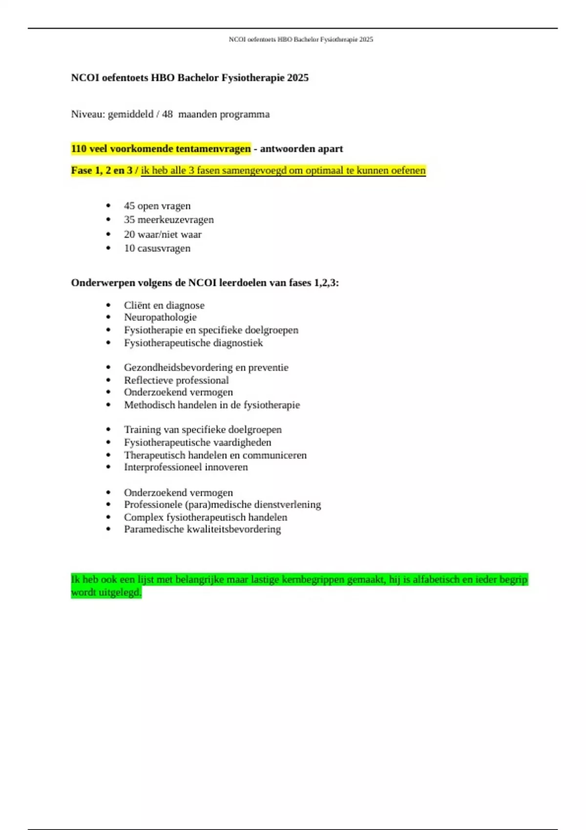 , NCOI oefentoets HBO Bachelor Fysiotherapie 2025