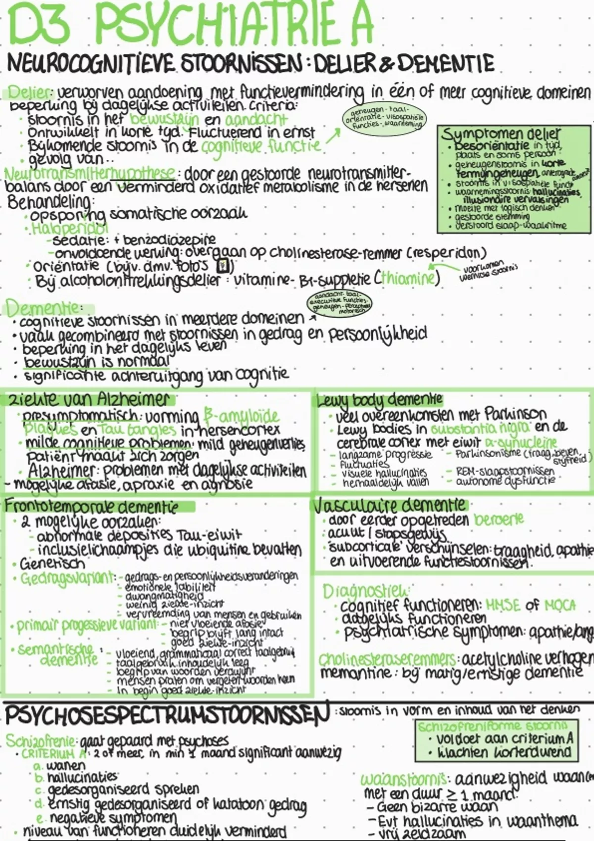 Complete en overzichtelijke handgeschreven samenvatting van cluster D KVS, module D3 Psychiatrie A, van de studie geneeskunde van het Radboud.