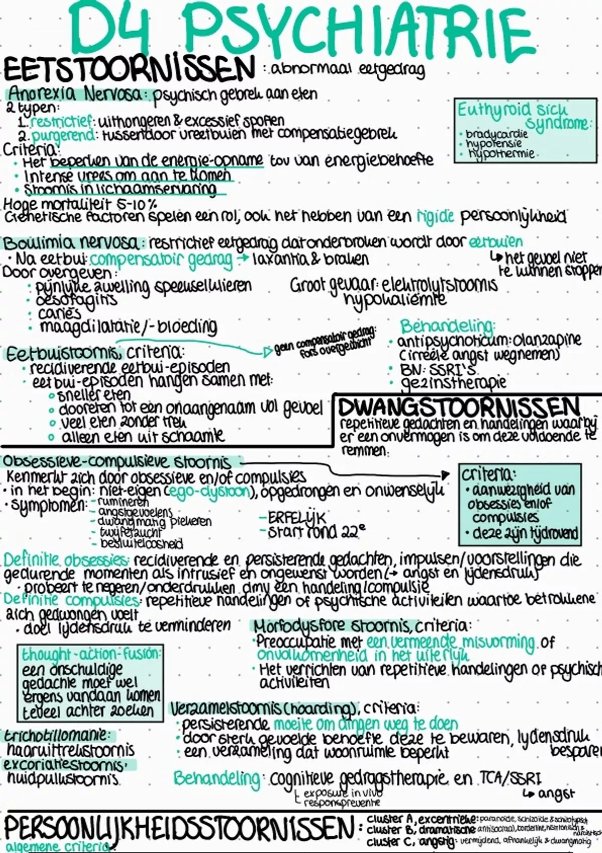 Complete en overzichtelijke handgeschreven samenvatting van cluster D KVS, module D4 Psychiatrie B, van de studie geneeskunde van het Radboud.