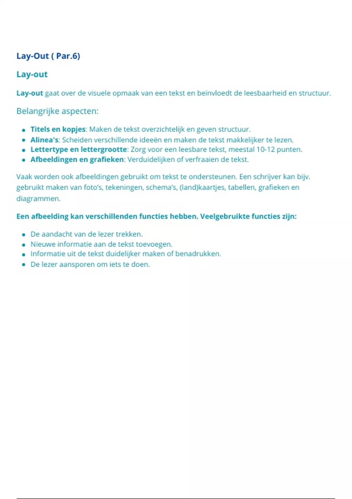 Lay-out gaat over de visuele opmaak van een tekst en beïnvloedt de leesbaarheid en structuur.