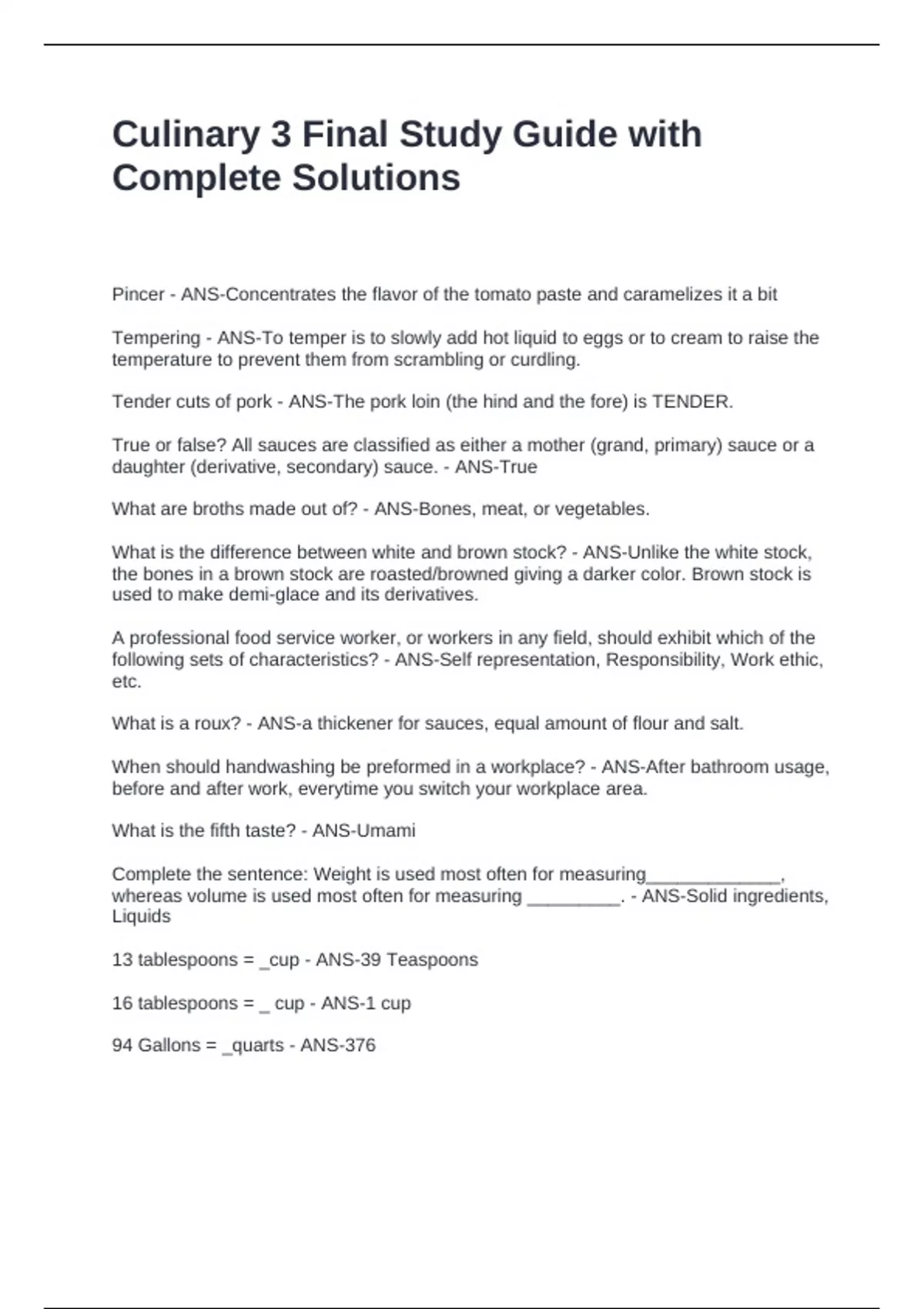 Culinary 3 Final Study Guide with Complete Solutions
