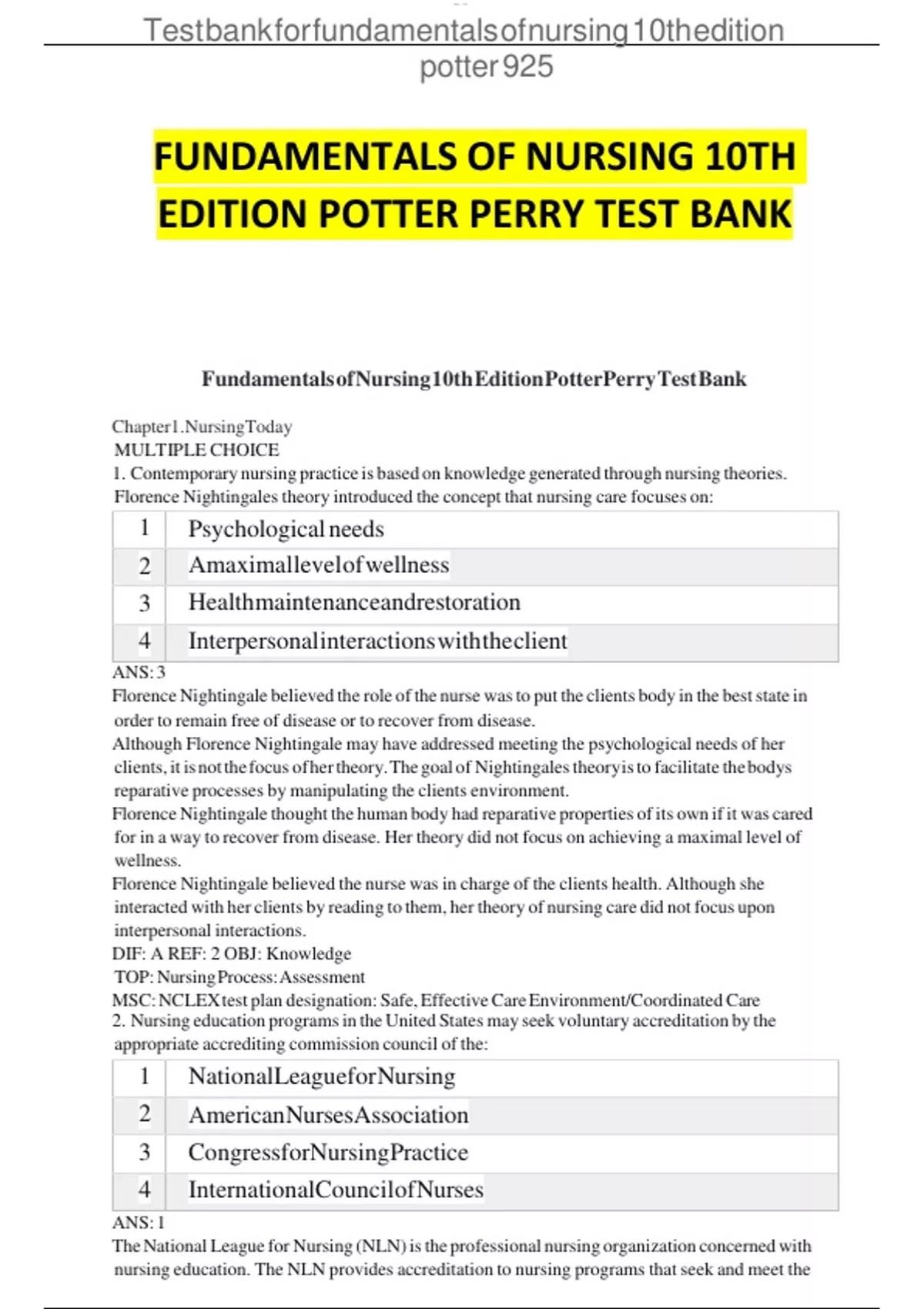 FUNDAMENTALS OF NURSING 10TH EDITION POTTER PERRY TEST BANK