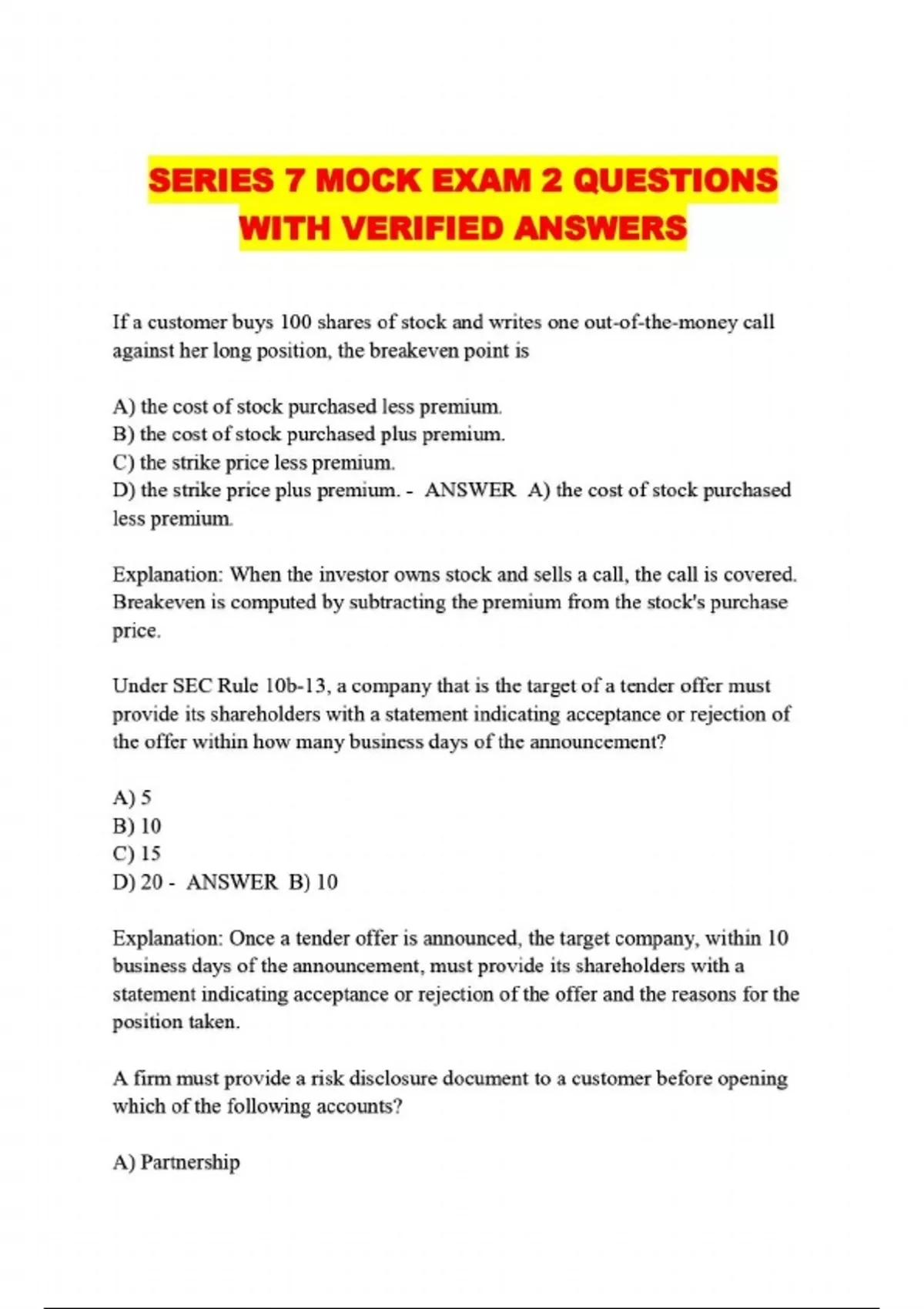 SERIES 7 MOCK EXAM 2 QUESTIONS WITH VERIFIED ANSWERS....