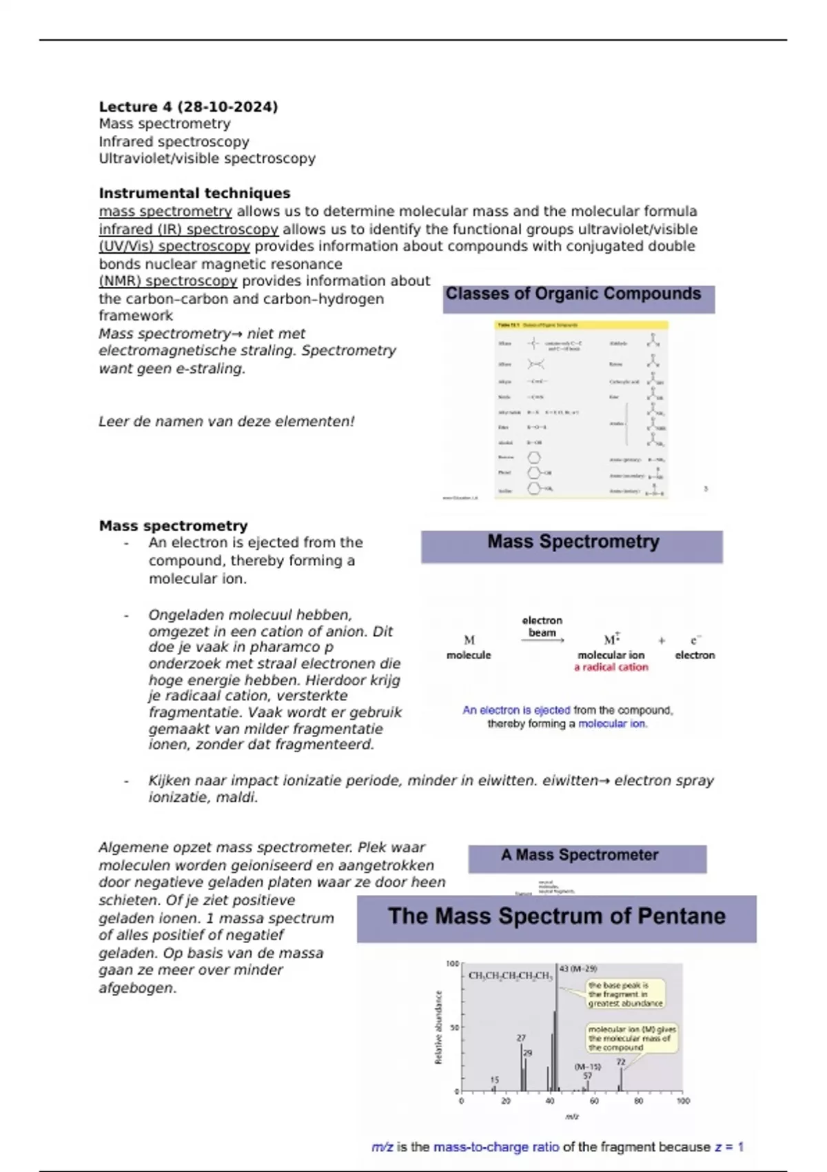 m/z (massa over lading). Pentaan molecuul, willekeurige binding weggelaten→ cation.
