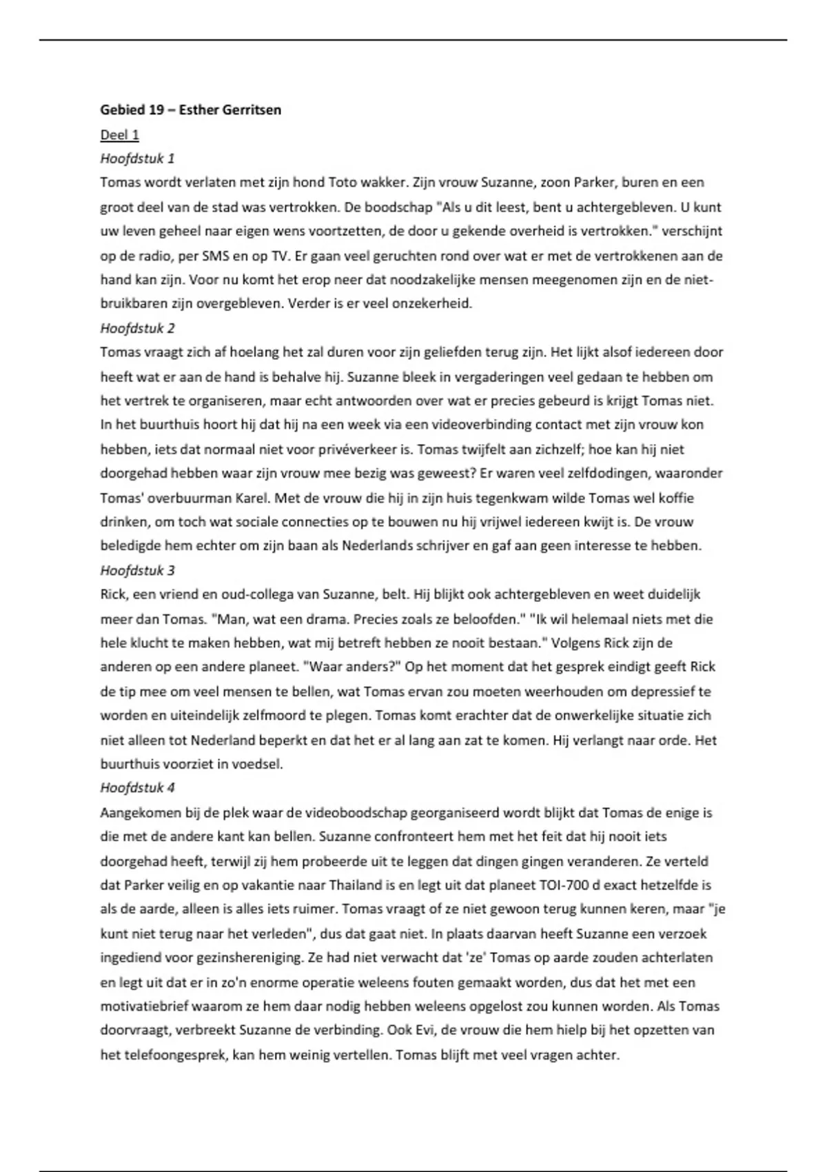 Uitgebreide samenvatting van de dystopische roman "Gebied 19", geschreven door Esther Gerritsen. Perfect voor de Nederlands mondeling of voor het schrijven van een essay, boekverslag, recensie, enz.