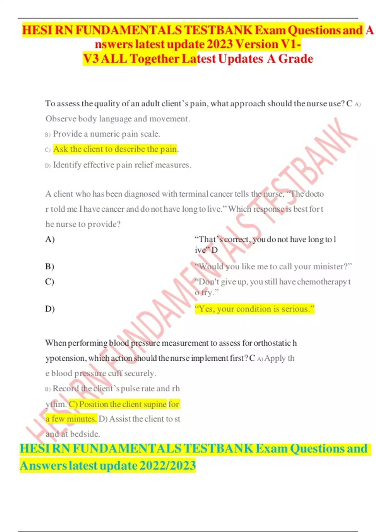 HESI RN FUNDAMENTALS TESTBANK Exam Questions and