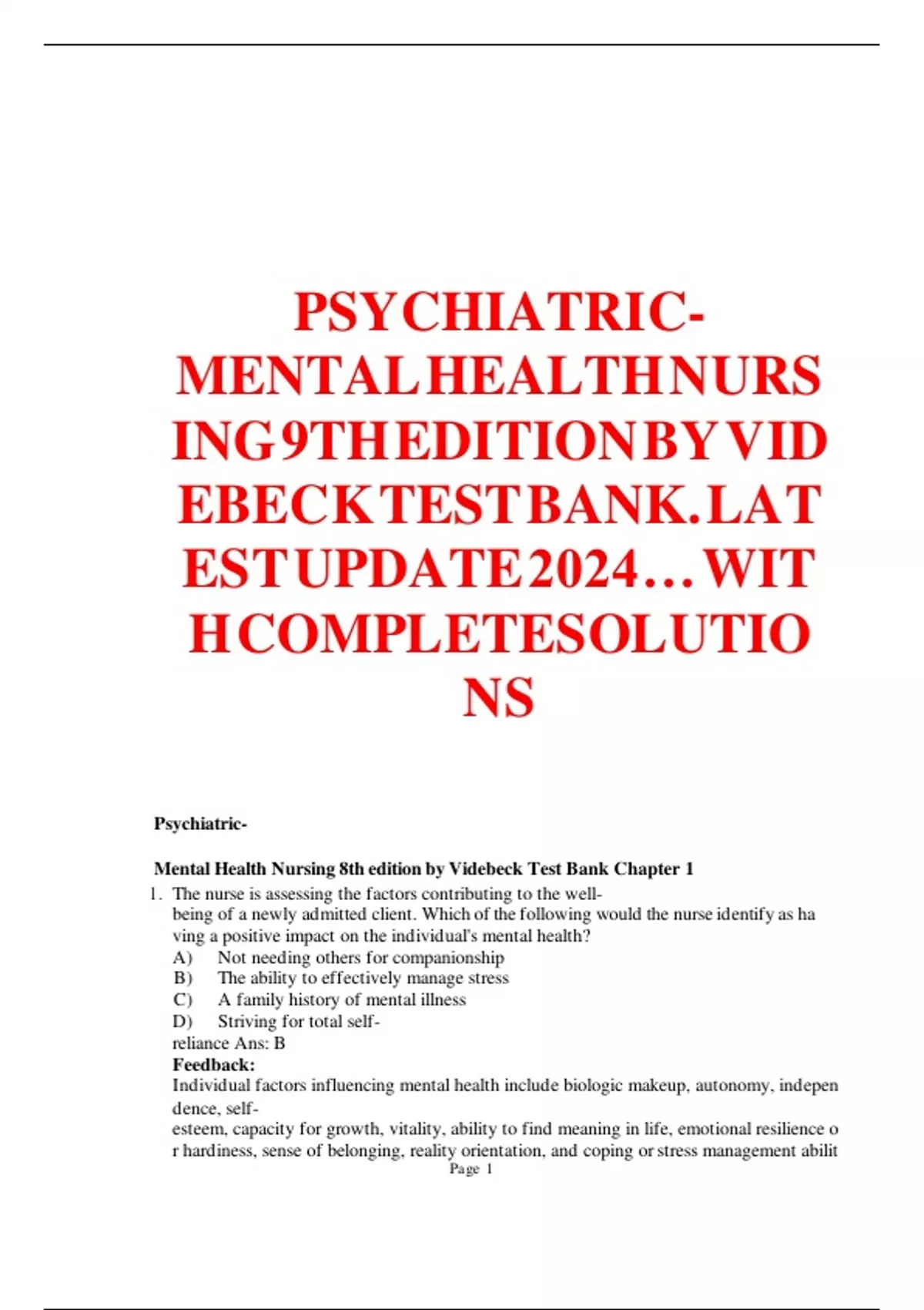 MentalnHealthnNursingn8thneditionnbynVidebecknTestnBanknChaptern1