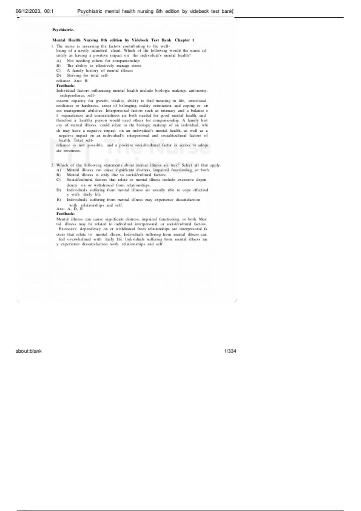 , 06/12/2023,m00:1 Psychiatric mmentalmhealthmnursingm8thmeditionmbymvidebeck mtestmbank[m