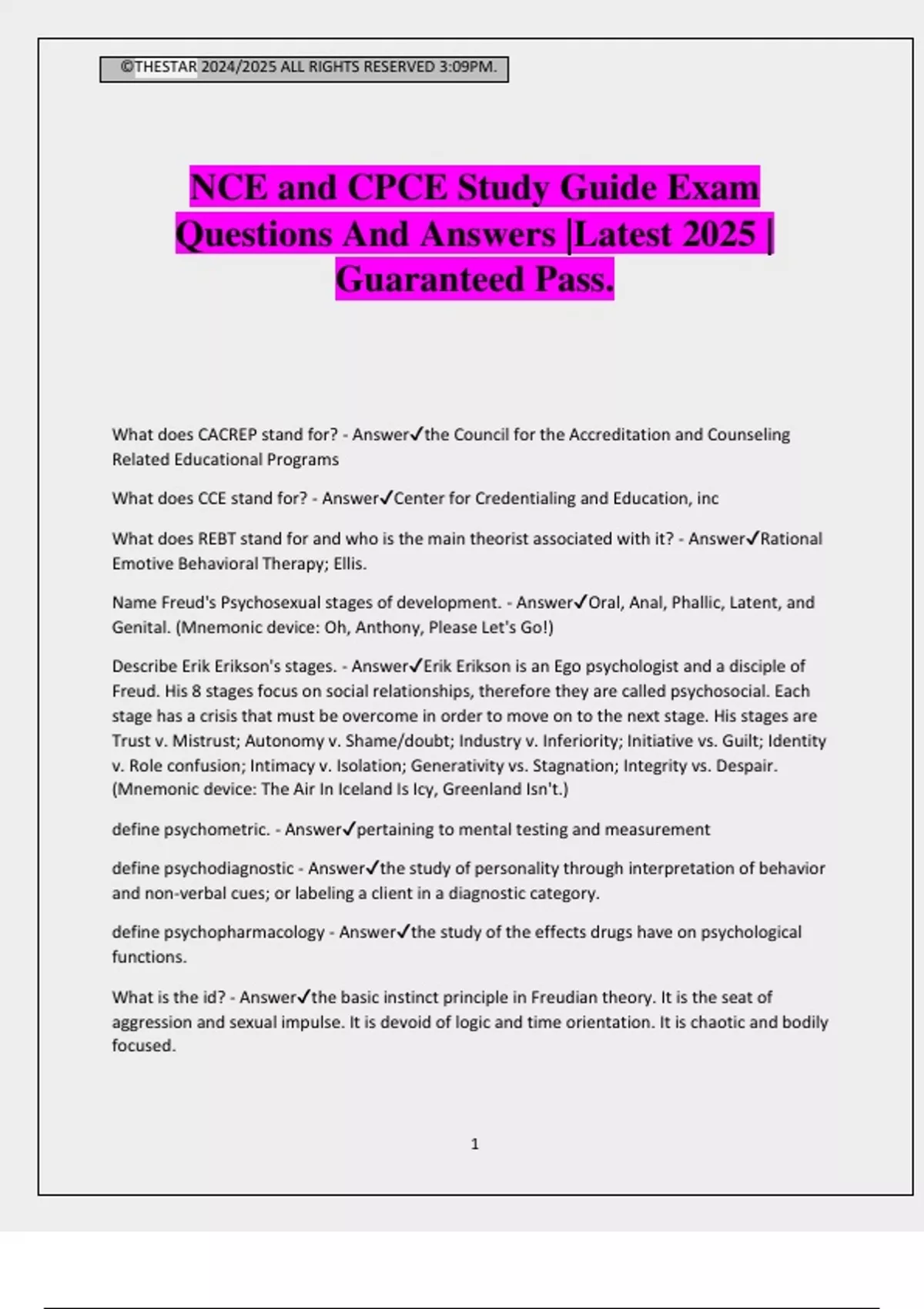 ©THESTAR 2024/2025 ALL RIGHTS RESERVED 3:09PM. 1 NCE and CPCE Study Guide Exam Questions And Answers |Latest 2025 | Guaranteed Pass. What does CACREP stand for? - Answerthe Council for the Accreditation and Counseling Related Educational Programs What does CCE stand for? - AnswerCenter for Credentialing and Education, inc What does REBT stand for and who is the main theorist associated with it? - AnswerRational Emotive Behavioral Therapy; Ellis. Name Freud's Psychosexual stages of development. - AnswerOral, Anal, Phallic, Latent, and Genital. (Mnemonic device: Oh, Anthony, Please Let's Go!) Describe Erik Erikson's stages. - AnswerErik Erikson is an Ego psychologist and a disciple of Freud. His 8 stages focus on social relationships, therefore they are called psychosocial. Each stage has a crisis that must be overcome in order to move on to the next stage. His stages are Trust v. Mistrust; Autonomy v. Shame/doubt; Industry v. Inferiority; Initiative vs. Guilt; Identity v. Role confusion; Intimacy v. Isolation; Generativity vs. Stagnation; Integrity vs. Despair. (Mnemonic device: The Air In Iceland Is Icy, Greenland Isn't.) define psychometric. - Answerpertaining to mental testing and measurement define psychodiagnostic - Answerthe study of personality through interpretation of behavior and non-verbal cues; or labeling a client in a diagnostic category. define psychopharmacology - Answerthe study of the effects drugs have on psychological functions. What is the id? - Answerthe basic instinct principle in Freudian theory. It is the seat of aggression and sexual impulse. It is devoid of logic and time orientation. It is chaotic and bodily focused. ©THESTAR 2024/2025 ALL RIGHTS RESERVED 3:09PM. 2 What is the ego? - Answerthis is the reality principle in Freudian theory. It indicates power of reasoning and control over behavior. It helps keep the impulses of the id in check. What is the superego? - Answerthe superego is the moralistic and idealistic principle in the Freudian theory. Which group of theorists believe "if you can't measure it, it doesn't exist"? - AnswerBehaviorists. They focus on O.O.B. The observable, objective behaviors. (My AP psych teacher in HS called it the O.O.B. tampon. gross, but it helped me remember it!) Who is the only psychoanalyst with a developmental theory that covered the entire lifespan? - AnswerErik Erikson's Psychosocial stages covered the entire lifespan. Each stage has a crisis or turning point. What theory is A. A. Brill associated with? - AnswerCareer theory Milton H. Erickson is associated with... - AnswerBrief psychotherapy and hypnosis. What field is Jean Piaget associated with? - AnswerCognitive Child Development Who is Jay Haley and what is the nature of his contribution to counseling? - AnswerHaley is most famous for his work on strategic and problem-solving therapy, more specifically with his use of the paradox technique. He also studied with Milton Erickson. Arnold Lazarus - AnswerHe is a known behavioral therapist who worked specifically with methods of desensitization and phobias. He is most associated with Multimodal Therapy. William Perry - AnswerHe is known for his work in adult cognitive development, specifically with college students. He worked a lot with the concept of "dualistic thinking" among college students, where everything is either black or white. (Memory technique: think of Katy Perry's song Hot and Cold to associate Perry with dualism.) Ed Neukrug - AnswerAlso a cognitive developmentalist. His work is similar to Perry's. He noted that college students initially think that their professor has all the answers (dualistic), but gradually get to a more relativistic way of thinking and realize that answers exist that are relative to a given situation. (Memory technique: "What do you THINK about Ed nuking the rug??" Think= cognitive dev, Ed Neukrug.) Robert Kegan - AnswerYet another adult cognitive developmentalist. SPecifically with interpersonal development. His theory was called the Constructive Model of Development- people construct reality throughout the lifespan. What are Piaget's stages of Cognitive Development in order? - AnswerSensorimotor; Preoperational; Concrete; Formal. These stages must occur in order, but may be experienced at varying ages. ©THESTAR 2024/2025 ALL RIGHTS RESERVED 3:09PM. 3 What is the major critique of Jean Piaget's research? - AnswerHe spent too much time observing his own kids, and thus drawing his conclusions from a small, specific, population. Who formulated the very first intelligence test? - AnswerAlfred Binet. In France. Oh la la! What is a t test? - AnswerAlso known as the Student's t, it is a statistical test used in formal experiments to determine if a statistical significance exists between the means of two normally distributed groups. Define Conservation. - AnswerA substance's mass, weight, and volume remain the same even if it changes shape. It most likely refers to volume and mass, though. A child who has not mastered this concept will not have flexible thinking. (Mastered during Piaget's Concrete Operational stage 7-11 years) Symbolic Schema - AnswerA schema is a system where the child tests out things in the physical world. An example of a symbolic schema is when a child uses a pie plate as a steering wheel (because it fits into the schema they have created for "Steering Wheel") This occurs in the Preoperational Stage. David Elkind's research supports what Piagetian concept? - AnswerElkind's statistical research supports Piaget's principle of conservation, with mass being the first and most easily understood concept for children, followed by weight and volume respectively. Lawrence Kohlberg expanded on Piaget's conceptualization of what type of development? - AnswerMoral development. Define Epigenetic - AnswerEpigenetic is the biological term borrowed from embryology. Each stage emerges from the one before it. It is systematic and follows a specific order. Who is the father of American B