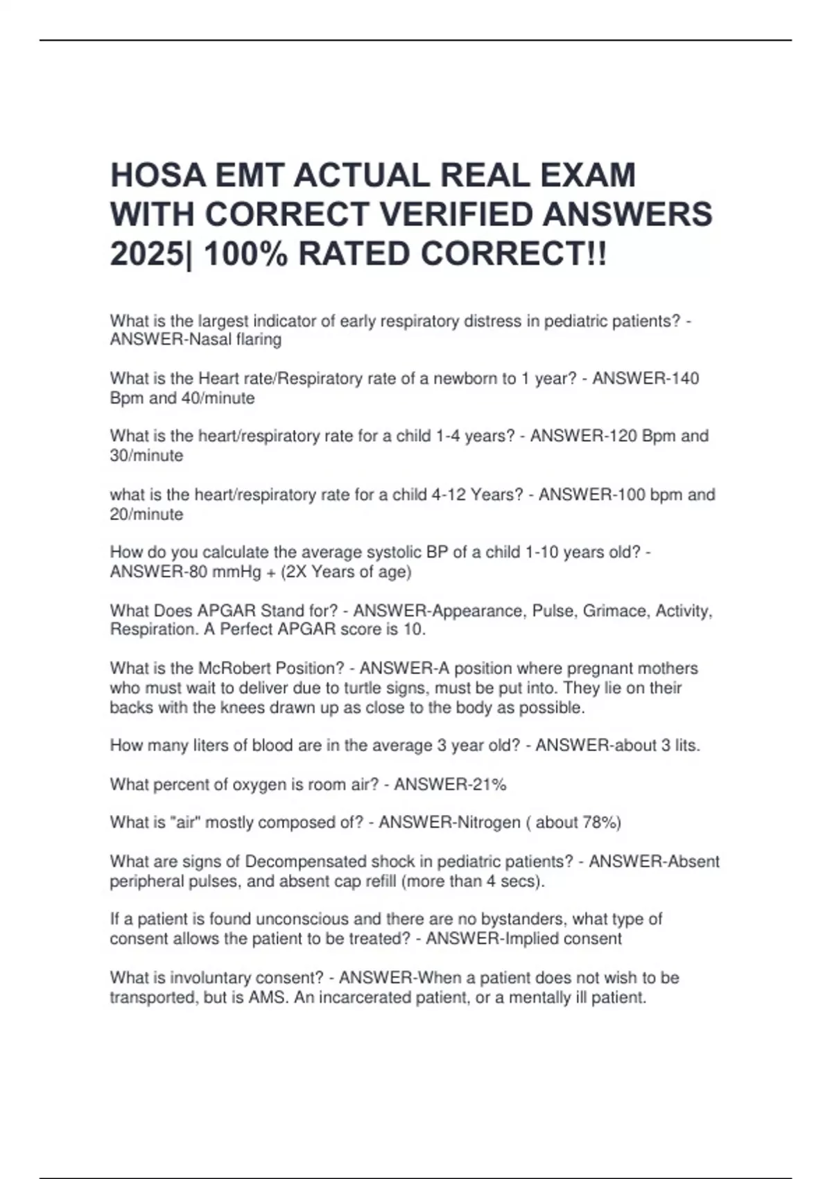 HOSA EMT ACTUAL REAL EXAM WITH CORRECT VERIFIED ANSWERS