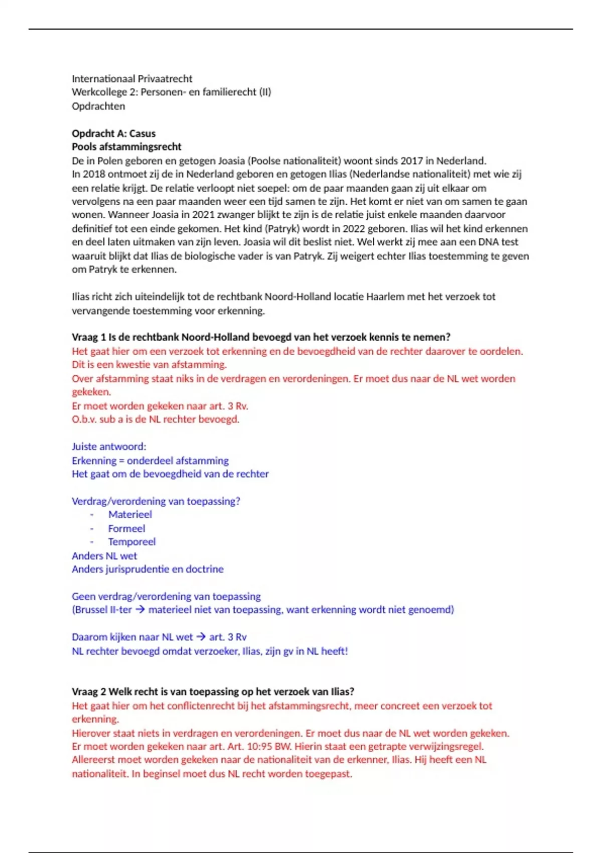 Aantekeningen van werkgroep 2 internationaal privaatrecht (IPR). De casusvragen, mijn antwoord en het juiste antwoord staan uitgewerkt.