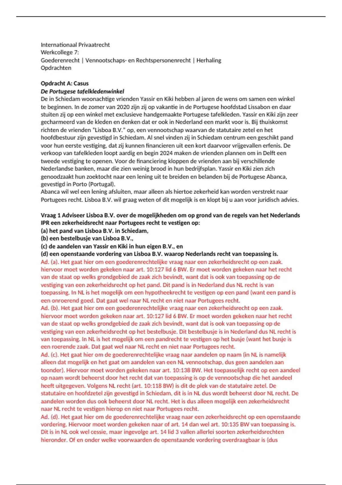 Aantekeningen werkgroep 7 internationaal privaatrecht (IPR) over goederenrecht en vennootschaps- en rechtspersonenrecht. Hierin zijn de casusvragen, mijn antwoorden en de juiste antwoorden uitgewerkt.