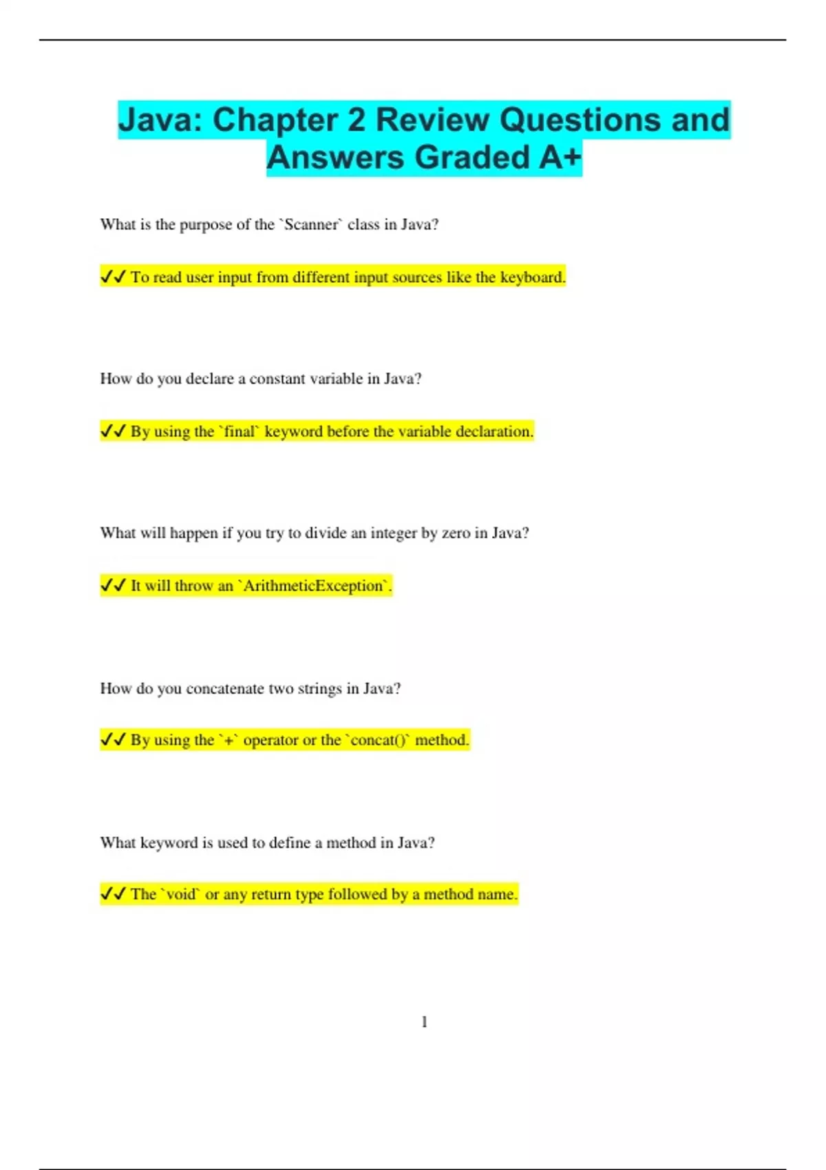 Java: Chapter 2 Review Questions and Answers Graded A+ What is the purpose of the `Scanner` class in Java? To read user input from different input sources like the keyboard. How do you declare a constant variable in Java? By using the `final` keyword before the variable declaration. What will happen if you try to divide an integer by zero in Java? It will throw an `ArithmeticException`. How do you concatenate two strings in Java? By using the `+` operator or the `concat()` method. What keyword is used to define a method in Java? The `void` or any return type followed by a method name. 2 What does the `modulus` operator (%) return? The remainder of a division operation. What is the default value of an integer variable in Java if not initialized? 0 How do you take an integer input from the user in Java? By using `Scanner` and calling `nextInt()`. What is the purpose of an `if` statement in Java? To execute a block of code only if a specified condition is true. How do you create a single-line comment in Java? By using `//` before the comment text. How do you create a multi-line comment in Java? By enclosing the comment text between `/*` and `*/`. 3 What is the output of `Sln("Java".length());`? 4 What happens if you try to store a `double` value into an `int` variable without casting? A compilation error occurs. How do you convert a `String` to an `int` in Java? By using `IInt(string)`. What is the result of `5 + 3 * 2` in Java? 11 (because multiplication has higher precedence than addition). What method is used to convert a string to uppercase in Java? `toUpperCase()` What will `Sln(10 / 3.0);` print? 3.
