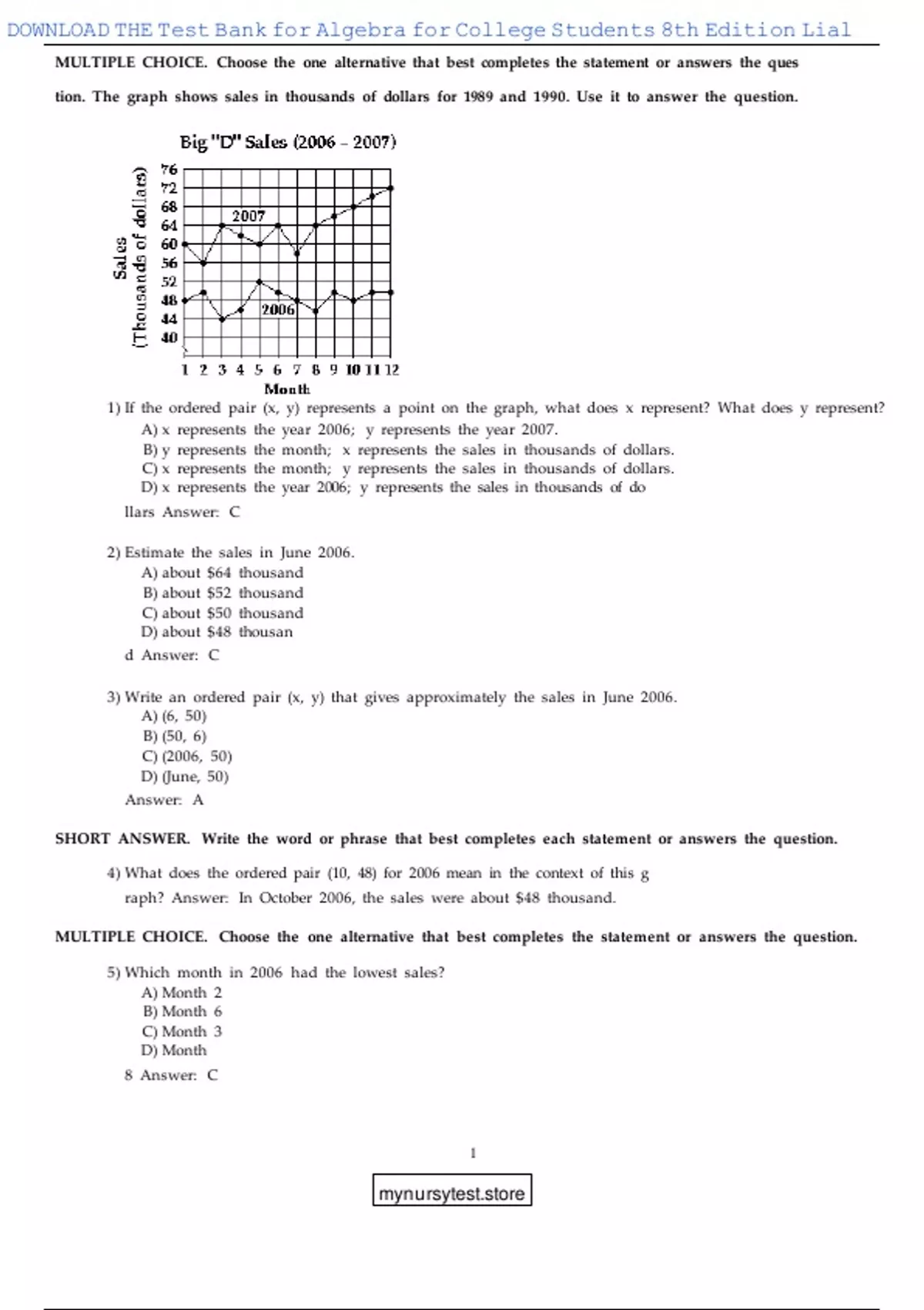 , DOWNLOAD THE Test Bank for Algebra for College Students 8th Edition Lial