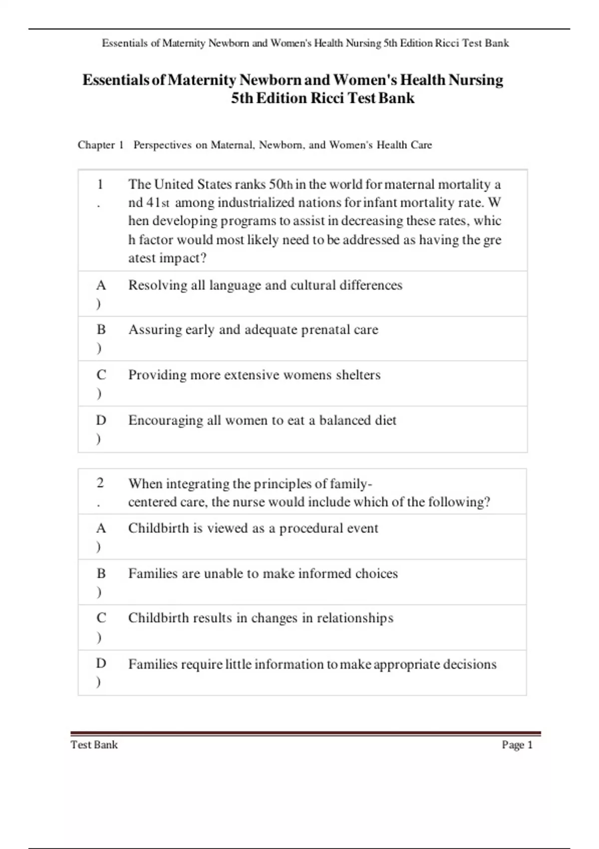 , Essentials5 of5Maternity 5Newborn5 and 5Women's5Health 5Nursing55th 5Edition5Ricci5 Test5 Bank