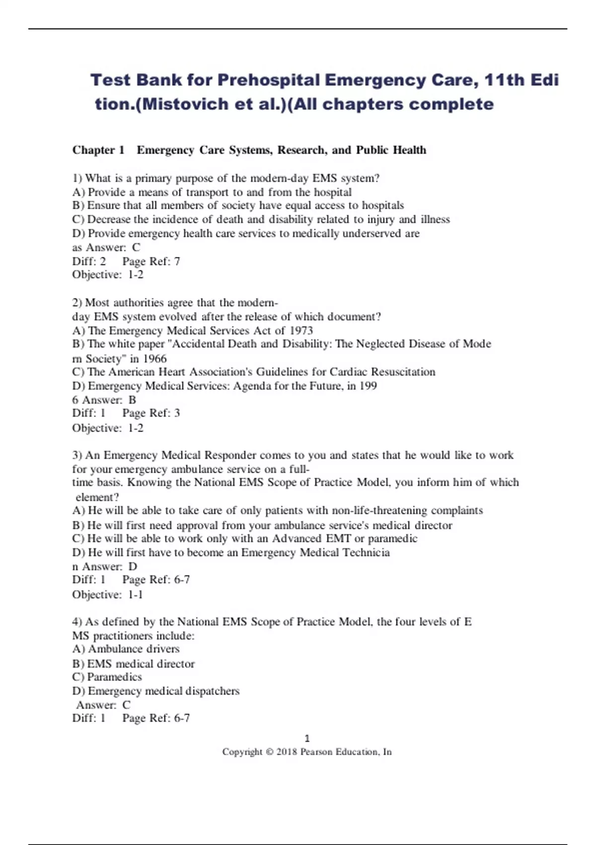 Test Bank for Prehospital Emergency Care, 11th Edi