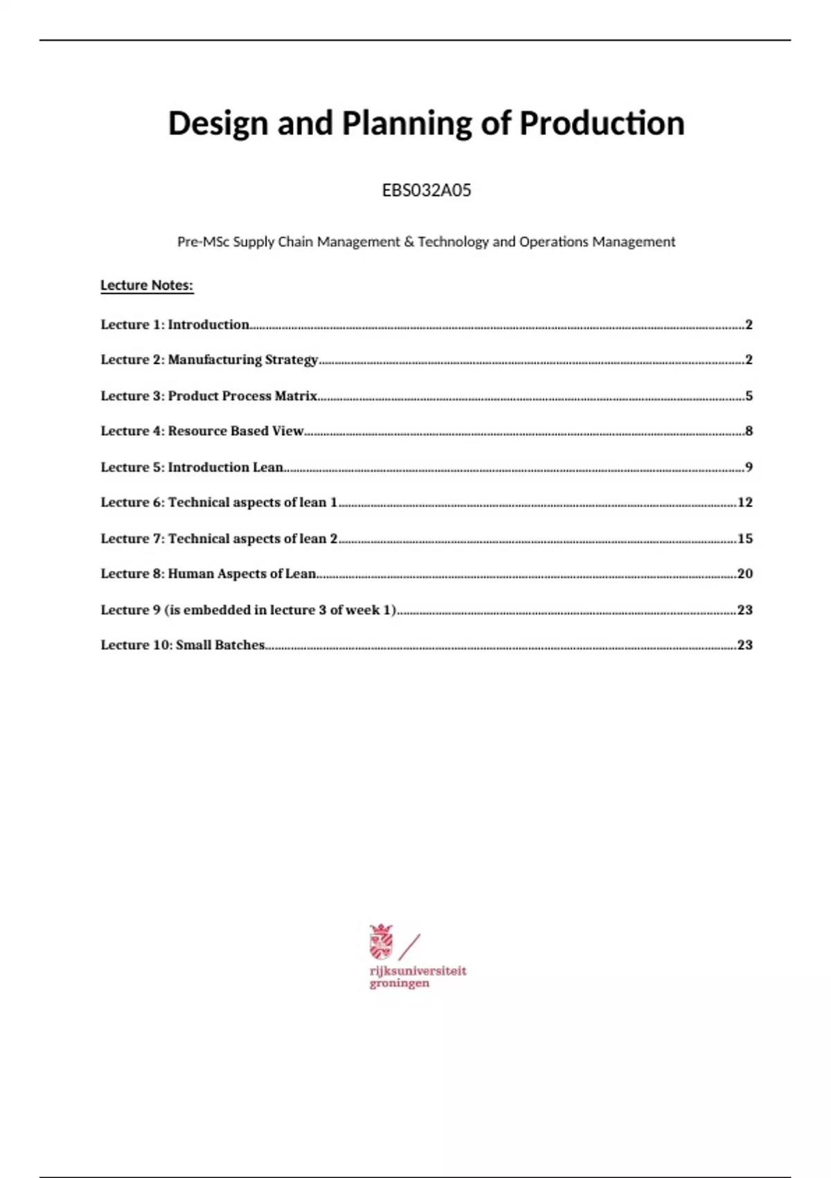 Dit document biedt een compleet overzicht van alle lectures (1-10) van het vak Design and Planning of Production (DPP) gegeven in de Pre-MSc Supply Chain Management en Technology and Operations Management aan de Rijksuniversiteit Groningen. Het document behandelt onderwerpen zoals Manufacturing Strategy, Lean Production, de Product-Process Matrix en de Resource-Based View.